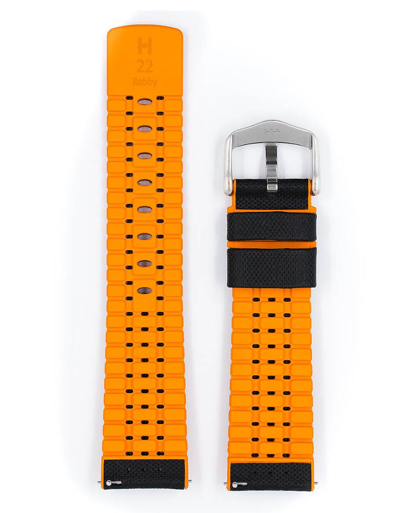 Řemínek k hodinkám, Hirsch Robby černý s oranžovou gumovou podložkou. Funkčnost a design v dokonalé harmonii – i v těch nejdrsnějších podmínkách. Italská teletina odolná proti opotřebení s přirozeným zvrásněním a vzhledem perforované plachtoviny. Speciální struktura pryžového jádra zaručuje rychlý odvod vlhkosti a nejvyšší komfort nošení. řemínek Hirsch Robby využívá teleskopy se systémem, který poskytuje možnost rychlého nasazení a sundání pásu bez použití nářadí.