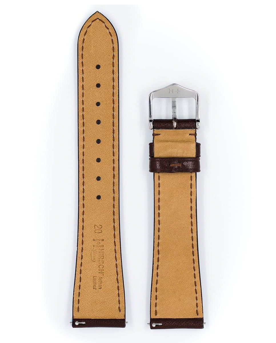 Hnědý řemínek k hodinkám Hirsch Siena . Pravá kůže z Pisy v Toskánsku, vyrobená a zušlechtěná postupem, který se používá po staletí. Kůže tradičně činěná rostlinnými taniny a barvená v sudech. Charakteristický dvoubarevný efekt vzniká ručním nanášením tmavšího odstínu barvy na exponovaná místa pokožky. Dokončovací operace prováděné ručně velmi zkušeným koželuhem dodávají popruhu jemný lesk. Hirschův model Siena odkazuje na staré italské řemeslné umění. Řemínek je vybaven teleskopy, které umožňují připevnit řemínek k hodinkám bez použití nářadí.