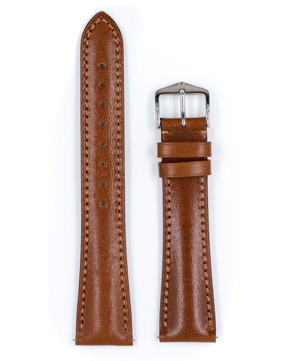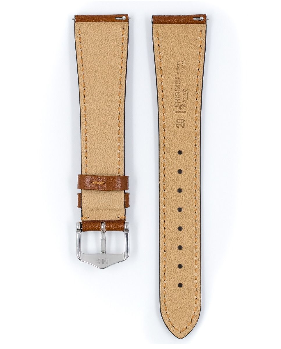 Řemínek k hodinkám Hirsch Siena zlatohnědý . Pravá kůže z Pisy v Toskánsku, vyrobená a zušlechtěná postupem, který se používá po staletí. Kůže tradičně činěná rostlinnými taniny a barvená v sudech. Charakteristický dvoubarevný efekt vzniká ručním nanášením tmavšího odstínu barvy na exponovaná místa pokožky. Dokončovací operace prováděné ručně velmi zkušeným koželuhem dodávají popruhu jemný lesk. Hirschův model Siena odkazuje na staré italské řemeslné umění. Řemínek je vybaven teleskopy, které umožňují připevnit řemínek k hodinkám bez použití nářadí.