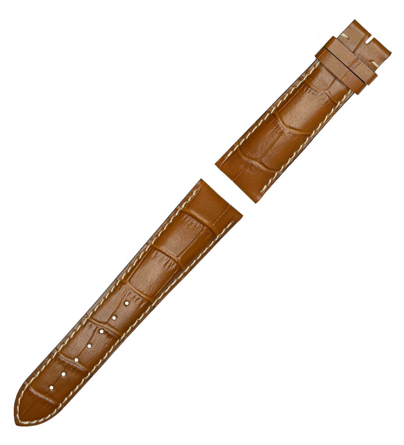 Longines L682108998 originální řemínek bez přezky pro pánské hodinky Longines. Vyrobeno z přírodní kůže ve zlaté, zlatohnědé barvě, s bílým prošíváním, vzor aligátora. Šířka 21 mm a 18 mm v místě upevnění spony a spony.