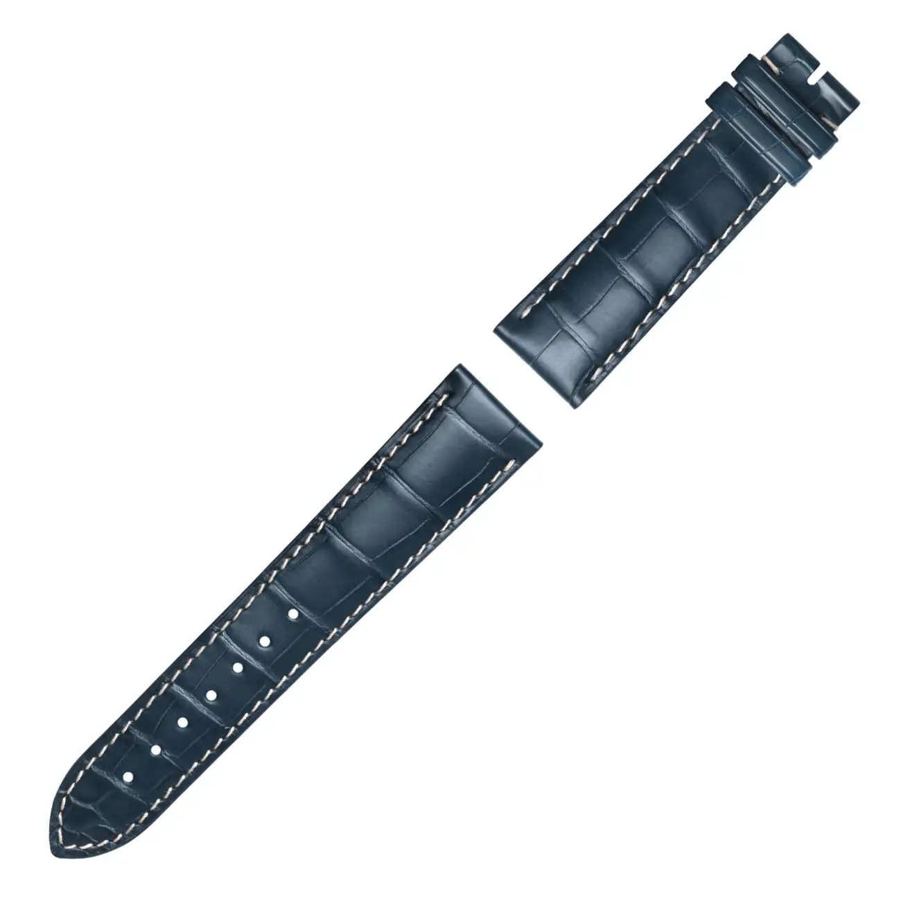 Originální řemínek Longines Master Collection je vyroben z aligátoří kůže v hluboké, matné barvě Navi Blue. Kontrastní bílé prošití podtrhuje elegantní charakter řemínku a harmonicky ladí s vytříbeným stylem hodinek Longines z této řady. Jemná textura kůže a precizní zpracování dodávají řemínku ušlechtilý, klasický vzhled – bez zbytečného lesku.