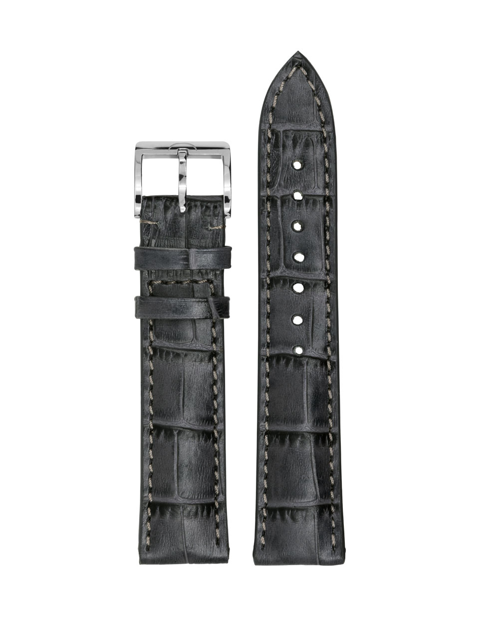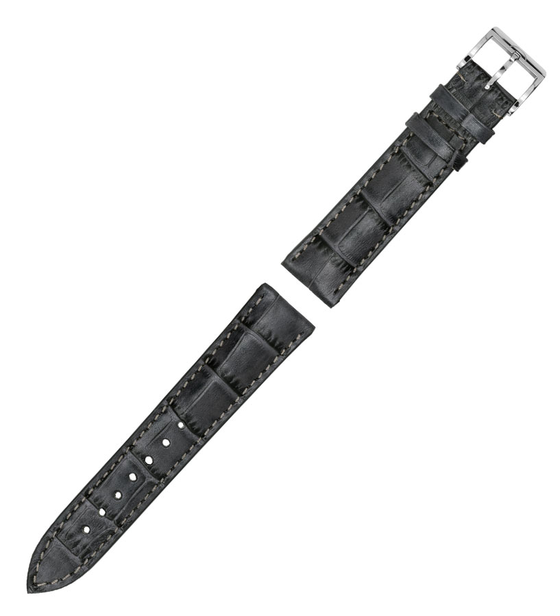 Originální řemínek k hodinkám MeisterSinger. Vyrobeno z přírodní šedé kůže s elegantním vzorem aligátora. Pásek je šitý šedou nití a zakončen ocelovou sponou ve vysokém lesku s logem značky.