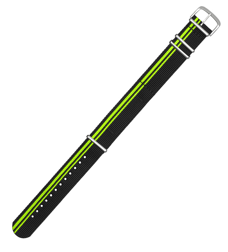 Originální, látkový NATO strap Traser 105741, černý se zelenými pruhy, šířka 22 mm. Pohodlné na nošení, voděodolné, ideální pro horké letní dny. Zakončeno ocelovou přezkou, sada obsahuje teleskopy pro upevnění popruhu.