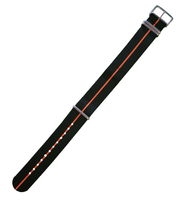 Originální, látkový NATO strap Traser 107419 , černý s oranžovým akcentem, šířka 22 mm. Pohodlné na nošení, voděodolné, ideální pro horké letní dny. Zakončeno ocelovou přezkou, sada obsahuje teleskopy pro upevnění popruhu.