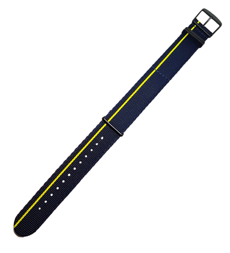 Originální, látkový NATO strap Traser 107806, tmavě modrá se žlutým akcentem, šířka 24 mm. Pohodlné na nošení, voděodolné, ideální pro horké letní dny. Zakončeno ocelovou přezkou v černé barvě, sada obsahuje teleskopy pro upevnění popruhu.