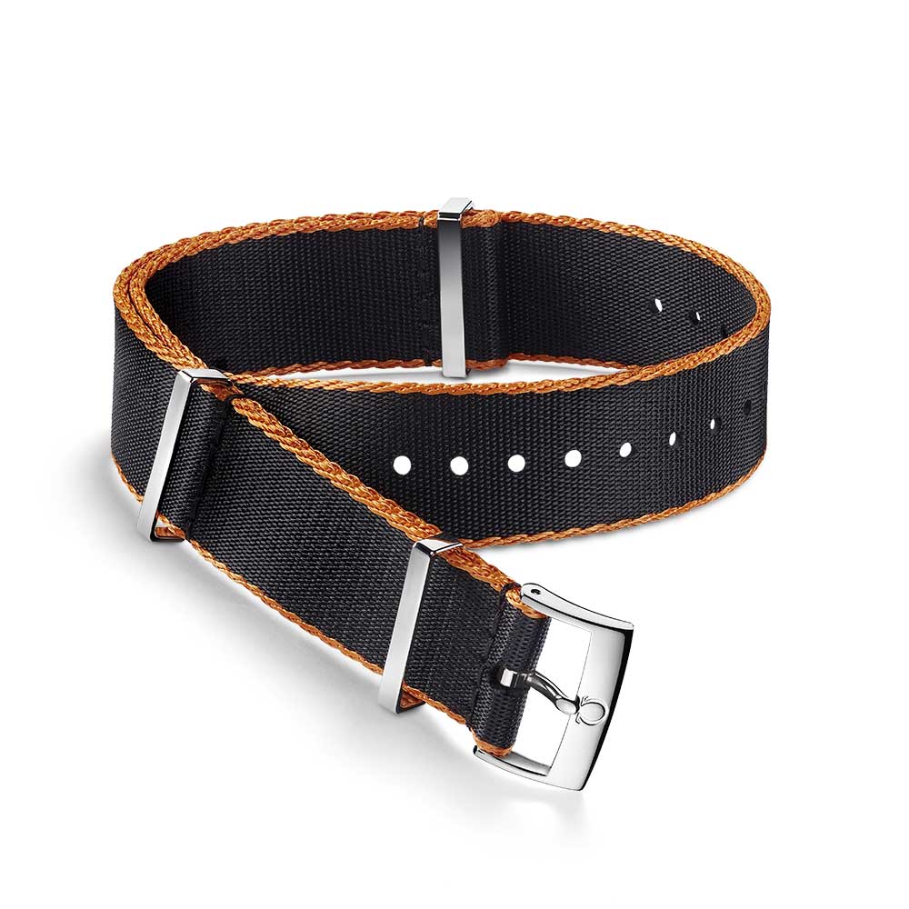 Originální řemínek OMEGA NATO pro hodinky Omega. Vyrobeno z polyamidu, plastu, který je velmi odolný a voděodolný. Černá barva s oranžovými stranami dokonale ladí s Omega Speedmaster a Omega Seamaster . Lesklá nerezová poutka a spona Omega. Podle specifikace výrobce se do rozteče 19 mm vejde i řemínek o šířce např. 20 mm, lze je tedy upravit na čtyři šířky: 19 mm, 20 mm a 21 mm, 22 mm. Celková délka 313 mm. Perfektní nabídka na jaro a léto, změňte charakter svých hodinek Omega a užijte si pohodlí při jejich nošení.