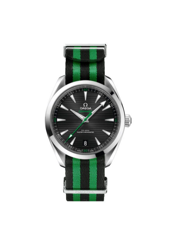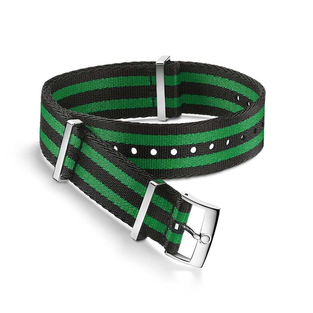 Originální řemínek OMEGA NATO pro hodinky Omega. Vyrobeno z polyamidu, plastu, který je velmi odolný a voděodolný. Černé pruhy proložené zelenou barvou se perfektně hodí pro Omega Speedmaster a Omega Seamaster . Lesklá nerezová poutka a spona Omega. Podle specifikace výrobce se do rozteče 19 mm vejde i pásek o šířce např. 20 mm, lze je tedy upravit na čtyři šířky: 19 mm, 20 mm a 21 mm, 22 mm. Celková délka 313 mm. Perfektní nabídka na jaro a léto, změňte charakter svých hodinek Omega a užijte si pohodlí při jejich nošení.