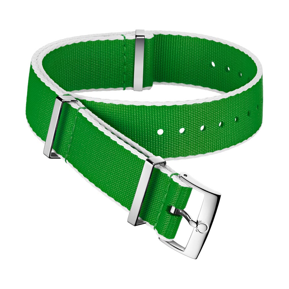 Originální řemínek ve stylu NATO pro hodinky Omega. Vyrobeno z polyamidu, měkkého a pohodlného plastu, který je velmi odolný a voděodolný. Zelená barva s bílými boky skvěle ladí se sportovními modely Omega Speedmaster nebo Omega Seamaster. Vysoce leštěná poutka na opasek z nerezové oceli a spona Omega. Pásek o šířce např. 20 mm se dle specifikace výrobce vejde i s roztečí 19 mm, lze je tedy nastavit až na čtyři šířky: 19 mm, 20 mm, 21 mm a 22 mm. Celková délka 313 mm. Ideální na jaro a léto, změňte charakter svých hodinek Omega a užijte si pohodlí při jejich nošení.