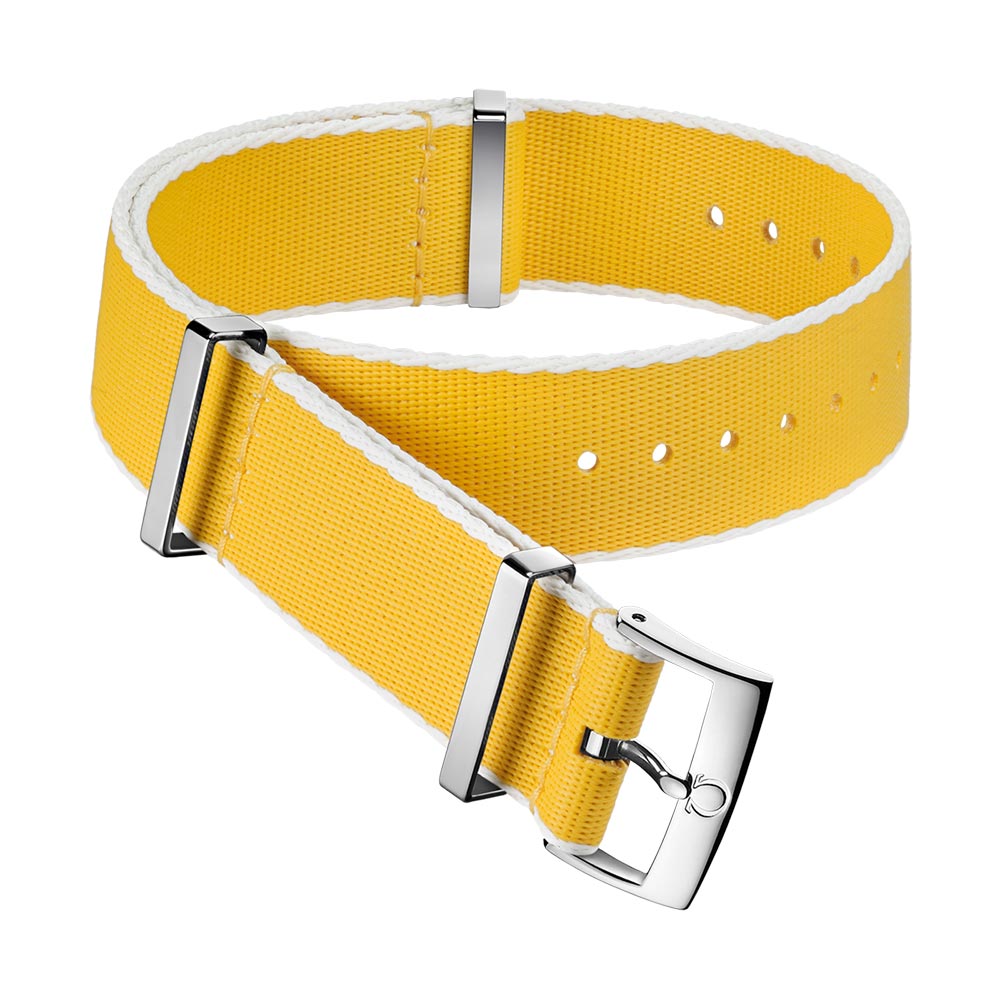 Originální řemínek ve stylu NATO pro hodinky Omega. Vyrobeno z polyamidu, měkkého a pohodlného plastu, který je velmi odolný a voděodolný. Žlutá barva s bílými boky skvěle ladí se sportovními modely Omega Speedmaster nebo Omega Seamaster . Vysoce leštěná poutka na opasek z nerezové oceli a spona Omega. Pásek o šířce např. 20 mm se dle specifikace výrobce vejde i na rozteč 19 mm, lze je tedy nastavit až na čtyři šířky: 19 mm, 20 mm, 21 mm, 22 mm. Celková délka 313 mm. Ideální na jaro a léto, změňte charakter svých hodinek Omega a užijte si pohodlí při jejich nošení.