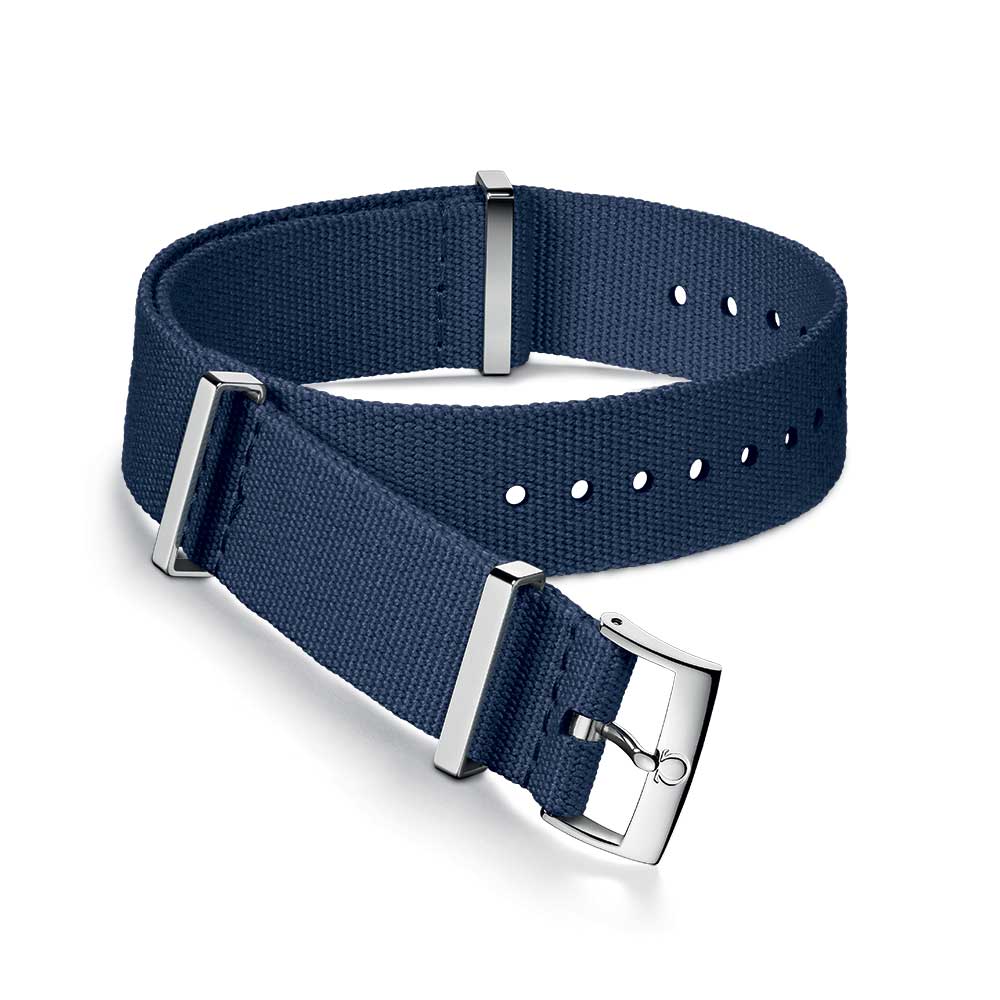 Originální řemínek OMEGA NATO pro hodinky Omega. Vyrobeno z polyamidu, plastu, který je velmi odolný a voděodolný. Modrá barva dokonale ladí s Omega Speedmaster a Omega Seamaster . Lesklá nerezová poutka a spona Omega. Podle specifikace výrobce se do rozteče 19 mm vejde i řemínek o šířce např. 20 mm, lze je tedy upravit na čtyři šířky: 19 mm, 20 mm a 21 mm, 22 mm. Celková délka 313mm. Perfektní nabídka na jaro a léto, změňte charakter svých hodinek Omega a užijte si pohodlí při jejich nošení.