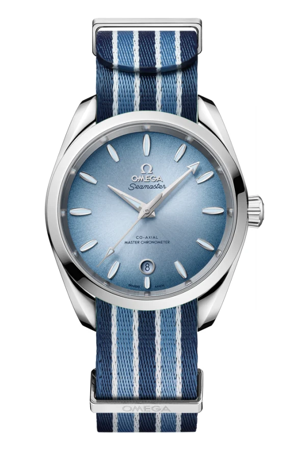 Řemínek Omega Seamaster NATO Blue v bílo-modrých pruzích je originální doplněk, který dodává hodinkám sportovní charakter a zajišťuje vysoký komfort nošení. Vzor inspirovaný mořem se skvěle hodí k potápěčským modelům, zejména k linii Seamaster.