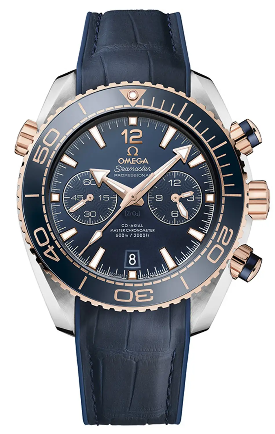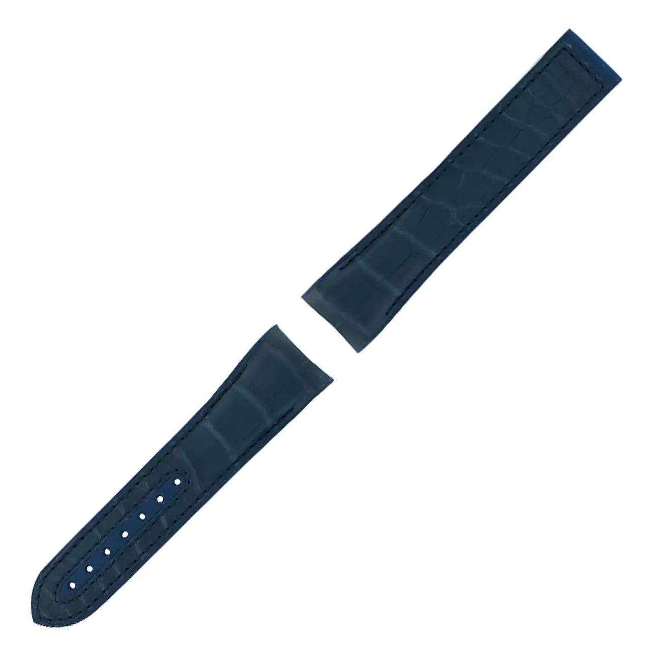 Řemínek je vyroben z kaučuku a z vnitřní strany má perforovanou strukturu, která usnadňuje odvod vlhkosti a zlepšuje ventilaci zápěstí. Vnější okraje jsou rovněž z modrého kaučuku, zatímco střední část je z krokodýlí kůže – vytváří to harmonickou kombinaci sportovního charakteru s nádechem luxusu. Námořnicky modrá barva skvěle ladí s ciferníkem hodinek Seamaster PO 600M a podtrhuje jejich námořní identitu.