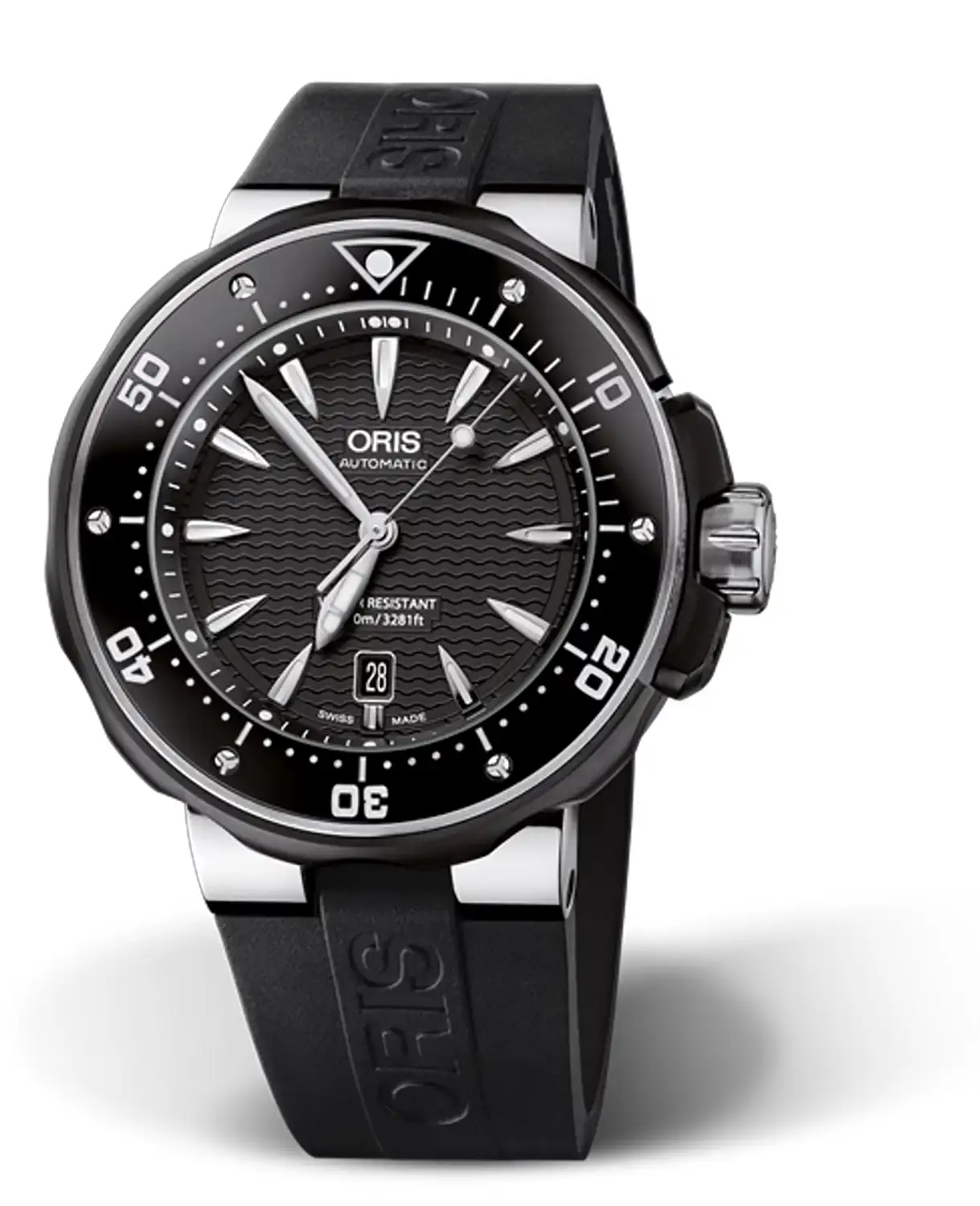 Řemínek je vyroben z černého kaučuku, který se dobře osvědčuje v náročných podmínkách, včetně potápění. Materiál je pružný, odolný vůči mořské a slané vodě a zároveň zajišťuje stabilní uchycení hodinek na zápěstí. Výrazné logo ORIS na obou částech řemínku podtrhuje jeho nástrojový, profesionální charakter.