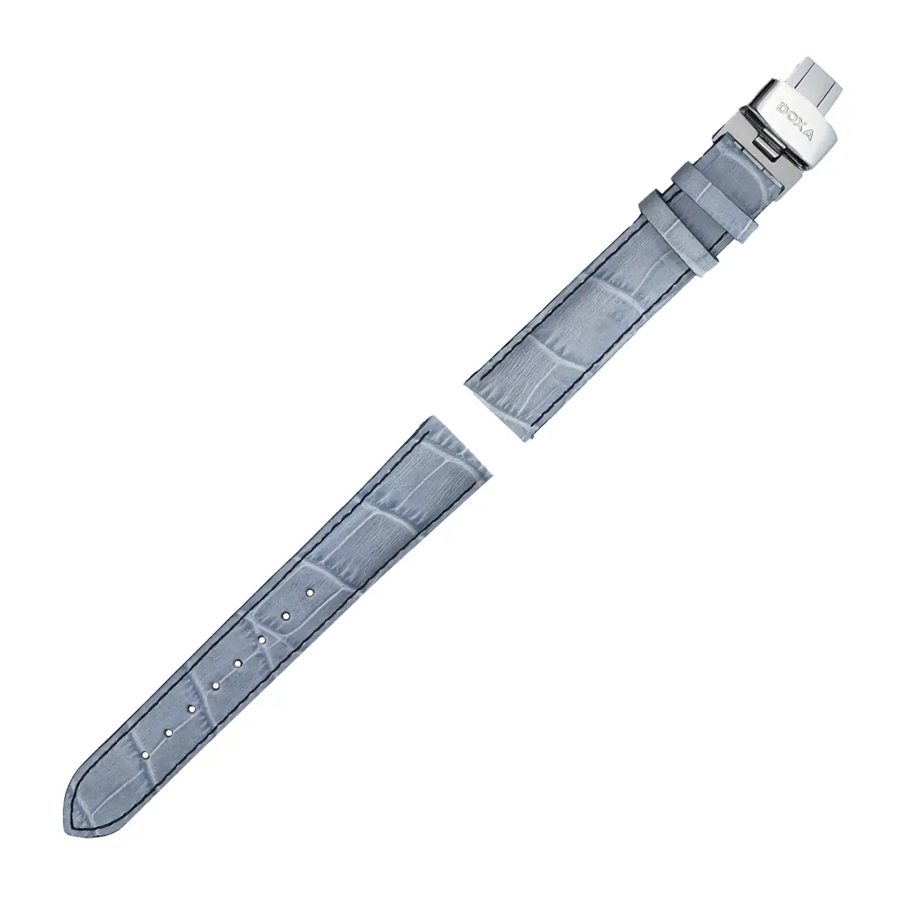 Řemínek o šířce 18 mm je vybaven ocelovou motýlkovou sponou, která se otevírá lehkým tahem, což zajišťuje pohodlí při nošení a dlouhou životnost. Díky standardní šířce uchycení se hodí nejen k modelu Doxa Trofeo Lady, ale také k dalším hodinkám Doxa s pouzdrem pro řemínek o šířce 18 mm.