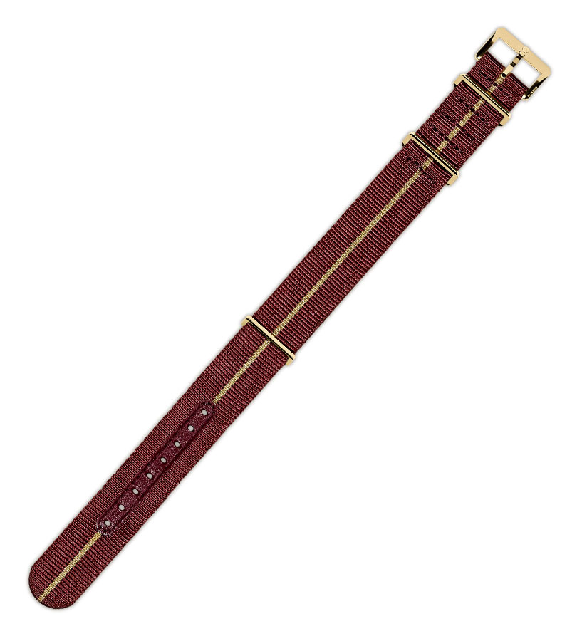 Červený řemínek Rado R070916110 21mm ve stylu NATO. Věnováno hodinkám Captain Cook Bronze s průměrem pouzdra 42 mm . Tento řemínek NATO je vyroben z odolné syntetické tkaniny se zlatou linkou uprostřed. Klasická přezka a poutka na opasek jsou z bronzu. Určeno pro modely Captain Cook Automatic Bronze s průměrem 42 mm, ale lze jej nosit s jakýmikoli hodinkami Rado s řemínkem 21 mm. Celková délka 267 mm.