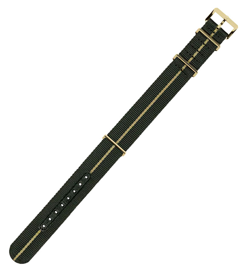 Řemínek Rado zelený R070917801 NATO styl šíře 21mm . Věnováno hodinkám Captain Cook Bronze s průměrem pouzdra 42 mm . Tento řemínek NATO je vyroben z odolné syntetické tkaniny se zlatou linkou uprostřed. Klasická přezka a poutka na opasek jsou z bronzu. Určeno pro modely Captain Cook Automatic Bronze o průměru 42 mm, ale lze jej nosit s jakýmikoli hodinkami Rado s řemínkem 21 mm. Celková délka 267 mm.