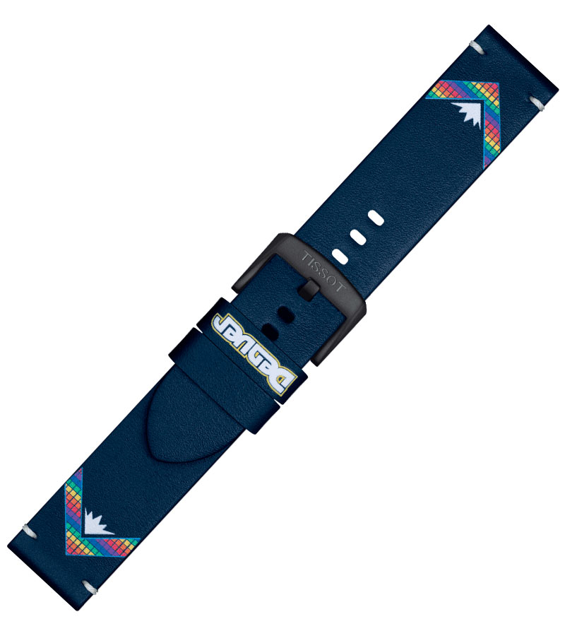 Originální voděodolný řemínek Tissot Denver Nuggets T852.047.540 o šířce 22 mm pro hodinky švýcarské značky Tissot. Vyrobeno z modré hovězí kůže. Na poutku na opasek najdeme grafiku názvu týmu NBA Denver Nuggets. Ocelová černá přezka s PVD povlakem zdobená logem značky. Opasek s klasickými dalekohledy s rychlovýměnným systémem. Řemínek Tissot T852.047.540 je ideální pro sportovní hodinky. řemínek se prodává v sadě se zařízením na stahování klasických pásů.