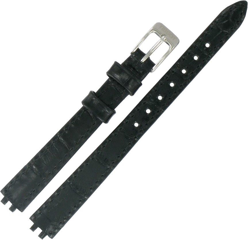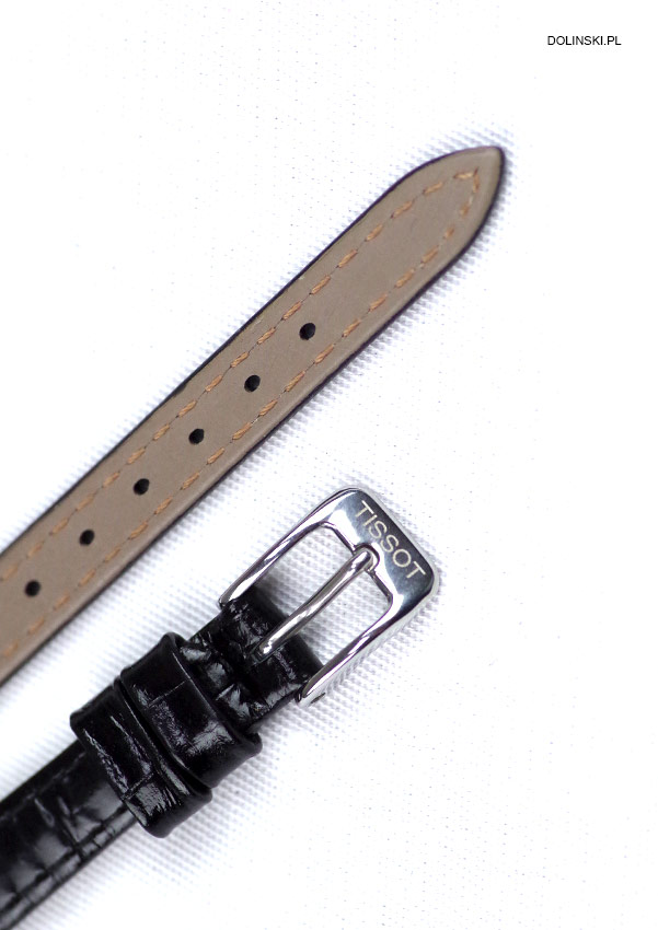 Originální řemínek k hodinkám Tissot Lovely. Vyrobeno z přírodní kůže, Tissot T600030316 v černé barvě s elegantním a klasickým vzhledem. Prošitý nití v barvě řemínku s texturou aligátora, pasuje pouze na hodinky Tissot Lovely s číslem na zadní straně pouzdra: T058009. Přezka je vyrobena z nerezové oceli a má čirý nápis Tissot.