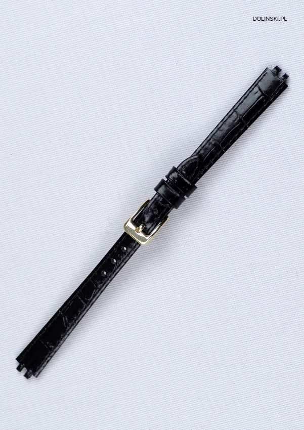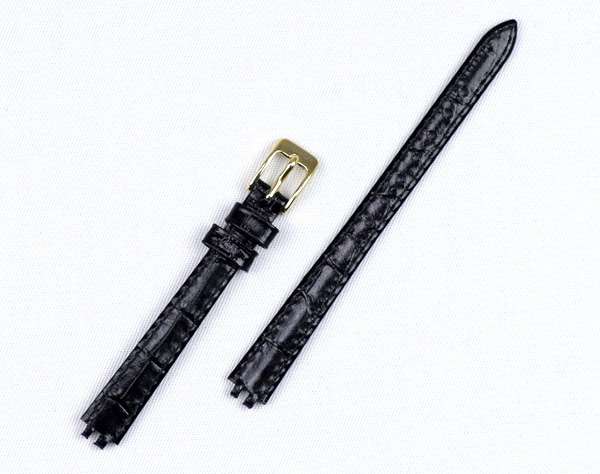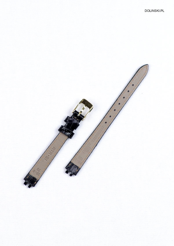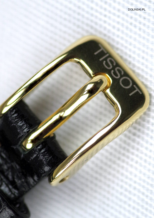 Originální řemínek k hodinkám Tissot Lovely. Vyrobeno z přírodní kůže, Tissot T600030317 v černé barvě s elegantním a klasickým vzhledem. Obšitý nití v barvě řemínku s texturou aligátora, pasuje pouze na hodinky Tissot Lovely s číslem na zadní straně pouzdra: T058009. Spona je vyrobena z nerezové oceli, zlacená PVD žlutým zlatem a má čirý nápis Tissot.