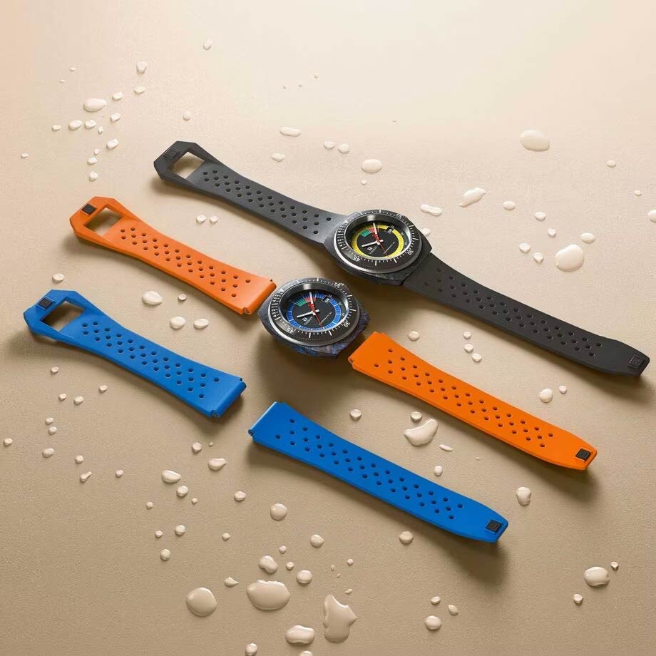 Originální, oranžový gumový řemínek Tissot Sideral S T852.048.861 věnovaný hodinkám Tissot Sideral S Powermatic 80 se servisním číslem T145407 A na zadní straně pouzdra, ze spodní části hodinek. Vyrobeno z voděodolné gumy, takže je ideální pro plavání nebo potápění. Řemínek má speciální teleskopy s rychlovýměnným systémem, který umožňuje montáž bez použití hodinářských nástrojů. řemínek se prodává v sadě se zařízením na stahování klasických pásů.