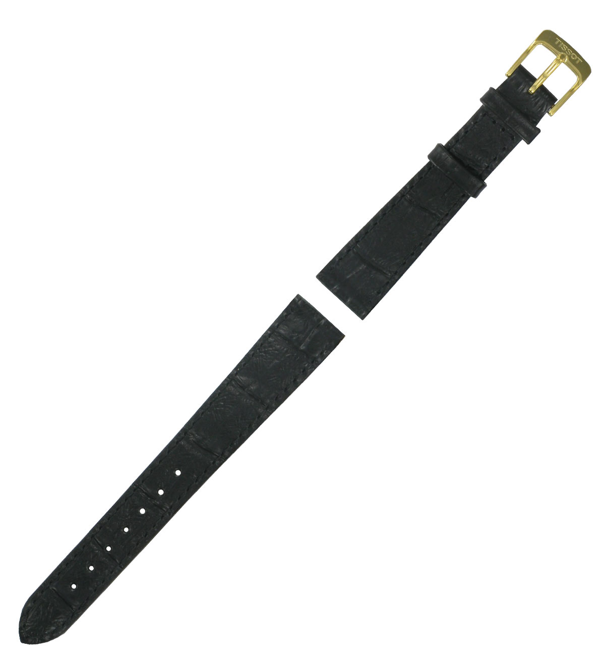 Originální dámský řemínek Tissot. Vyrobeno z přírodní kůže Tissot T600013015 v černé barvě s elegantním vzorem aligátora. Skvěle se hodí ke klasickým hodinkám Tissot, které lze osadit páskem o šířce 15 mm. Spona je vyrobena z nerezové oceli, zlacená žlutým zlatem, má čirý nápis Tissot.