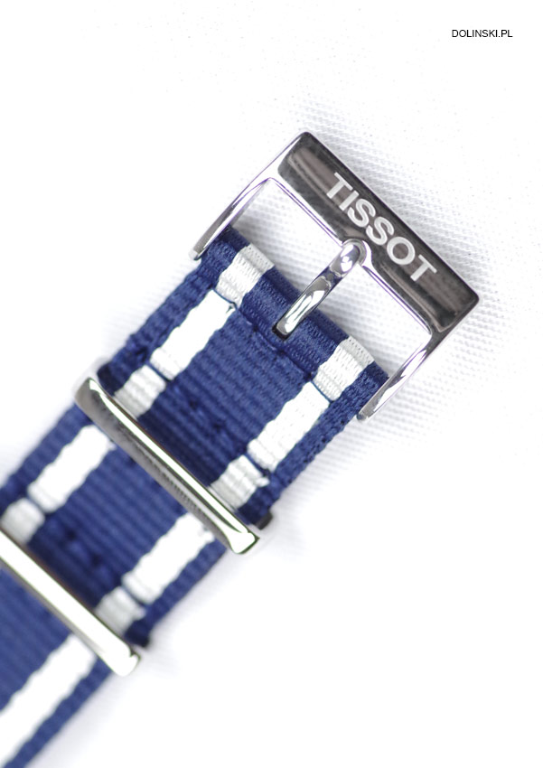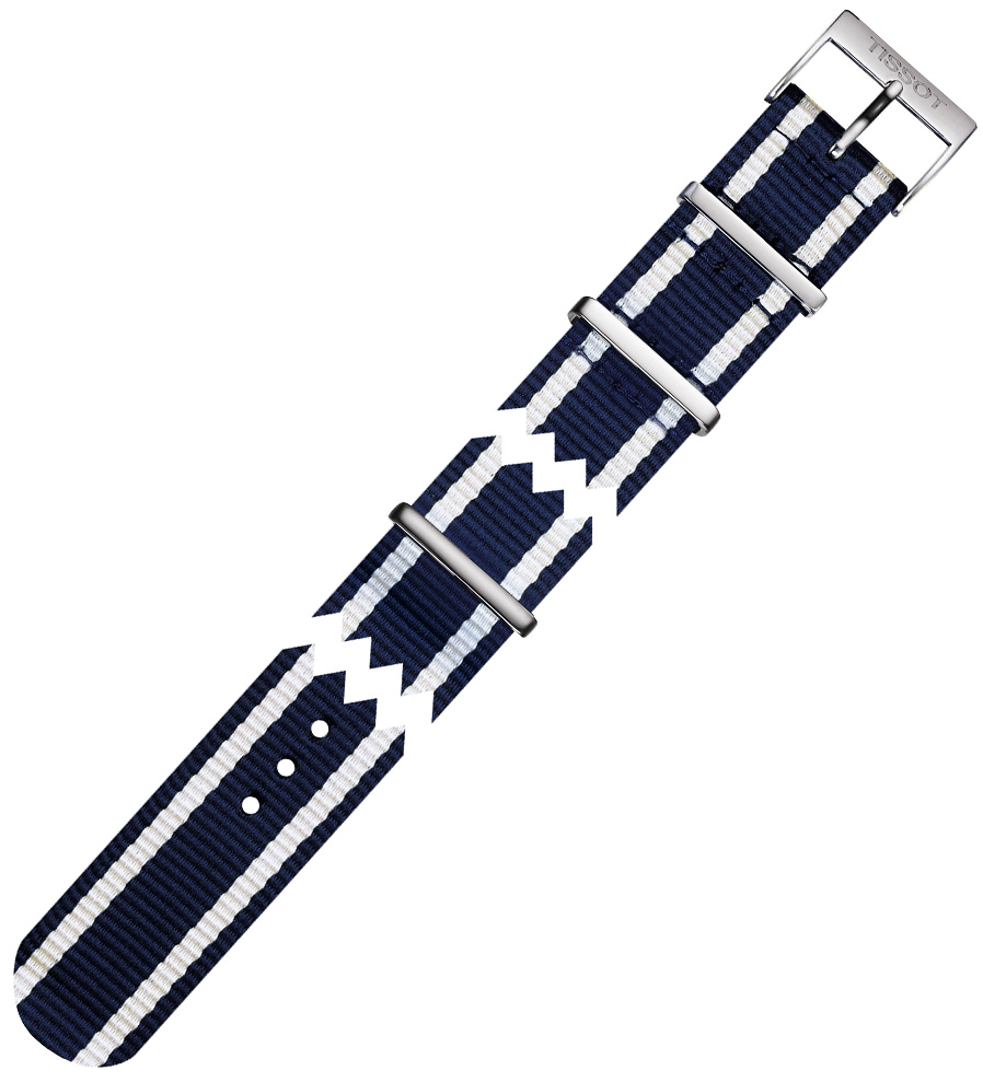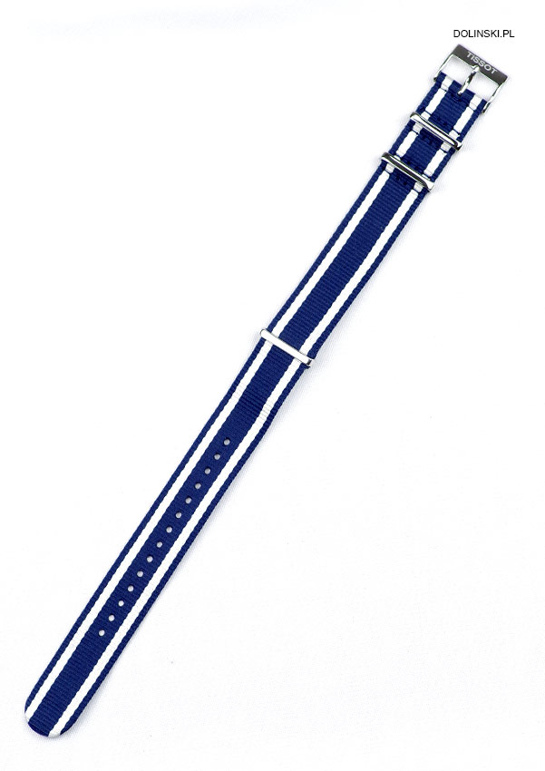 Originální řemínek k hodinkám Tissot Quickster Lugano. Látka Tissot T604036885 ve stylu NATO. Modrá barva s bílými pruhy. Věnováno modelu Quickster s číslem na pouzdru T095410, ale i dalším hodinkám, které lze osadit páskem o šířce 19 mm. Přezka je vyrobena z nerezové oceli a má čirý nápis Tissot.