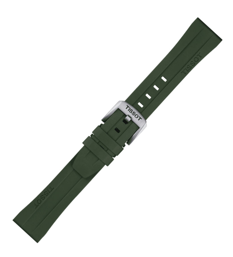 Originální voděodolný řemínek T852.049.054 o šířce 20 mm pro hodinky Tissot. Vyrobeno z khaki zelené gumy. Ocelová přezka zdobená logem značky. Řemínek má speciální teleskopy s rychlovýměnným systémem, který umožňuje montáž bez použití hodinářských nástrojů. Řemínek Tissot T852.044.054 je ideální pro sportovní a klasické hodinky. řemínek se prodává v sadě se zařízením na stahování klasických pásů.