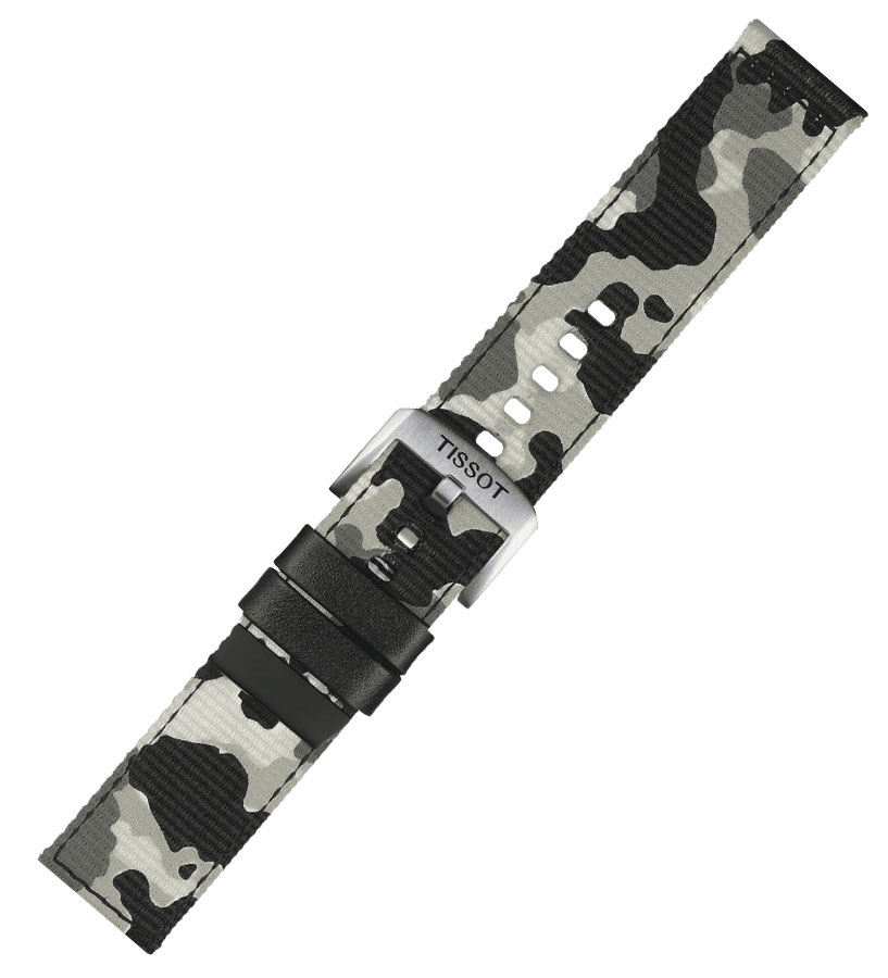 Originální řemínek T852.046.771 široký 22 mm pro hodinky Tissot. Vyrobeno z khaki textilního materiálu s camo vzorem. Kožená poutka na opasek a konec opasku dodávají odolnost a pohodlí. Ocelová přezka zdobená logem značky. Řemínek má speciální teleskopy s rychlovýměnným systémem, který umožňuje montáž bez použití hodinářských nástrojů. řemínek se prodává v sadě se zařízením na stahování klasických pásů.