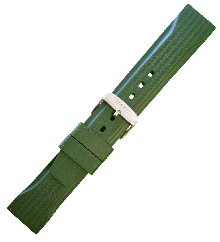 Originální, gumový řemínek Traser 107420 v zelené barvě s karbonovým vzorem. Věnováno modelu P67 Officer Pro GunMetal Lime , ale pasuje i na jiné hodinky Traser, kde lze použít 22mm pásek. Měkký, pohodlný na nošení a především voděodolný, perfektní společník pro průzkum pod vodou. Zakončeno ocelovou přezkou, sada obsahuje teleskopy pro upevnění popruhu.