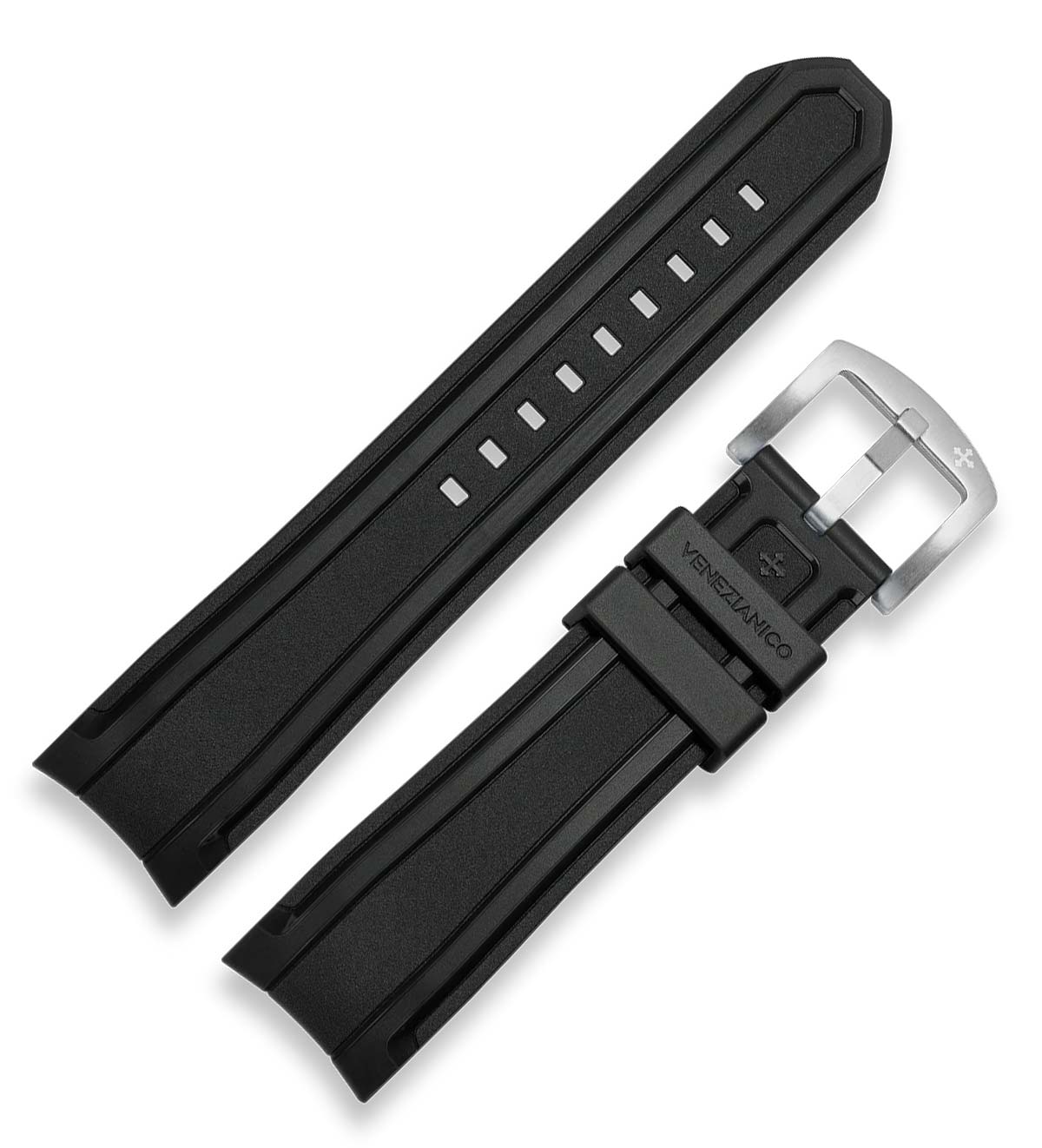 Originální 22mm široký gumový pásek pro hodinky Venezianico. Vyrobeno z voděodolné, měkké a příjemné gumy, ideální na plavání. Na spodní straně je speciální vzor, díky kterému ruka dýchá a v horkých dnech se nepotí. Masivní ocelová přezka stříbrné barvy.