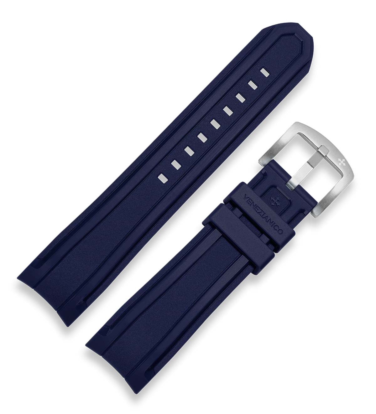 Originální modrý gumový pásek o šířce 22 mm pro hodinky Venezianico. Vyrobeno z voděodolné, měkké a příjemné gumy, ideální na plavání. Na spodní straně je speciální vzor, díky kterému ruka dýchá a v horkých dnech se nepotí. Masivní ocelová přezka stříbrné barvy.