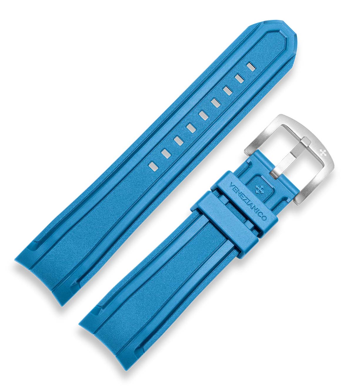 Originální světle modrý gumový pásek o šířce 22 mm pro hodinky Venezianico. Vyrobeno z voděodolné, měkké a příjemné gumy, ideální na plavání. Na spodní straně je speciální vzor, díky kterému ruka dýchá a v horkých dnech se nepotí. Masivní ocelová přezka stříbrné barvy.