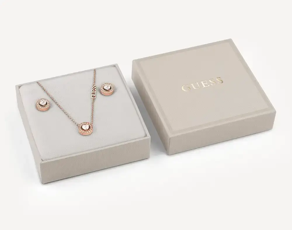 Sada šperků Guess M'Ama Non M'Ama JUBS04694JWRGT/U je elegantní volba, která obsahuje náušnice a náramek z nerezové oceli, pozlacené růžovým zlatem. Náramek má řetízek s charmsem ve tvaru srdce, ozdobeným krystalem solitaire, a náušnice mají tvar srdce se stejným krystalem. Celý set je zdoben třpytivými krystalky a kubickými zirkony. Náramek je zapínán na háček a náušnice mají zapínání na pecky.