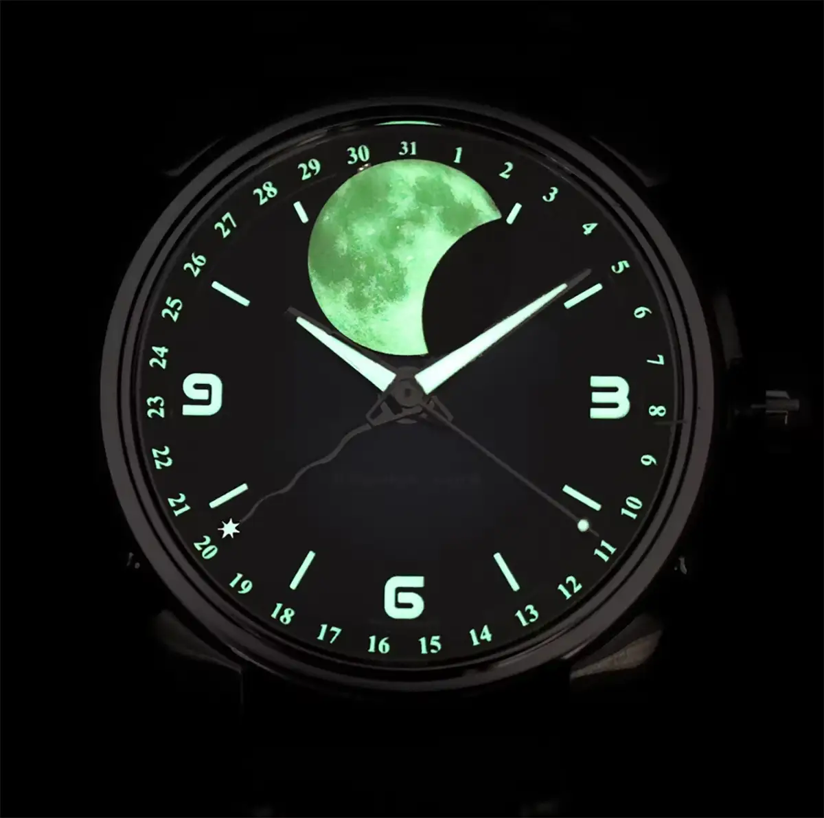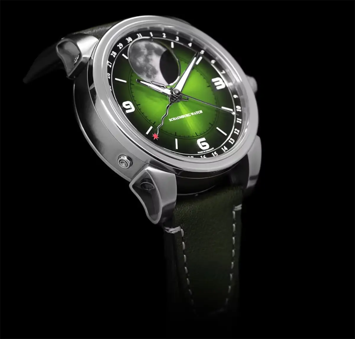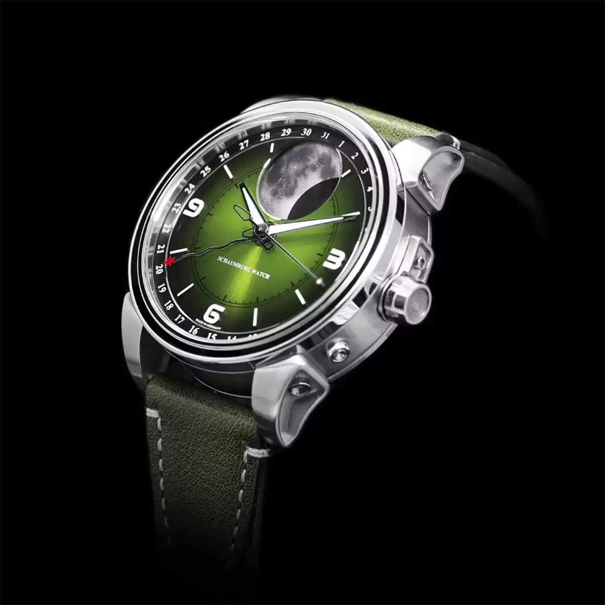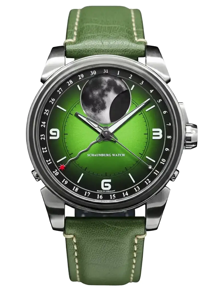 Hodinky Schaumburg Perpetual MooN Parallax II představují fascinující spojení pokročilé astronomie s hlubokou smaragdovou estetikou, která okamžitě přitahuje pohled k zápěstí. Centrálním prvkem tohoto modelu je spektakulární fotorealistický Měsíc o průměru 13,4 mm, který díky luminiscenční hmotě Superluminova A-Grade vyzařuje v temnotě mystický svit. Dynamický zelený číselník s gradientem plynule přechází od intenzivního smaragdu ve středu k téměř černým tónům u okrajů, což ve spojení se slunečním brusem vytváří výjimečnou hloubku.