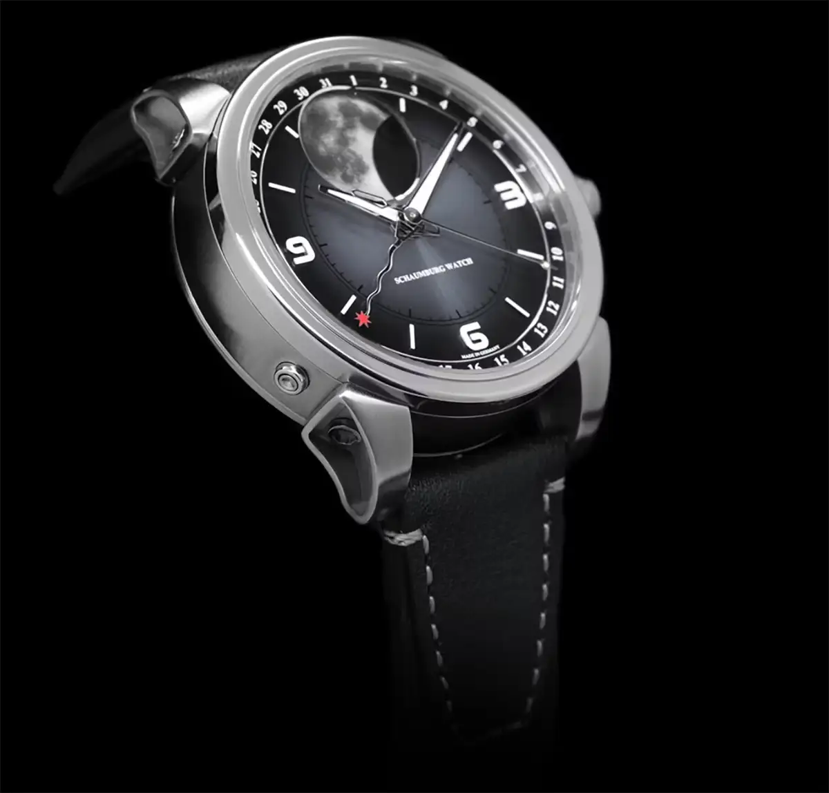 Schaumburg Perpetual MooN Parallax III je kvintesencí technické elegance, v níž se syrový, monochromatický design setkává se silou astronomických komplikací. Nejvýraznějším prvkem je číselník s gradientovým efektem, který plynule přechází od hluboké šedi ve středu k syté černi na okrajích a vytváří ideální pozadí pro fotorealistický Měsíc. Saténový sluneční brus způsobuje, že hra světla na číselníku je jemná, a přitom mimořádně výrazná pod vypouklým safírovým sklem s antireflexní vrstvou.