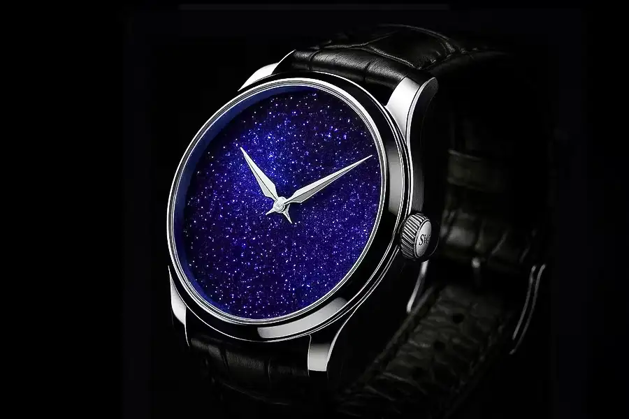 To, co činí tento minerál výjimečným, jsou mikroskopické částice jiných minerálů uvězněné v jeho struktuře, které se pod vlivem světla rozzáří tisíci jisker. Díky tomu není číselník plochý; má neuvěřitelnou hloubku a trojrozměrnost, připomínající Mléčnou dráhu zachycenou v ocelovém rámu. V závislosti na úhlu natočení zápěstí číselník ožívá, jednou se jeví téměř černý, aby se vzápětí rozzářil hvězdným prachem, což činí aventurín v hodinářství jedním z nejprestižnějších dekorativních materiálů.