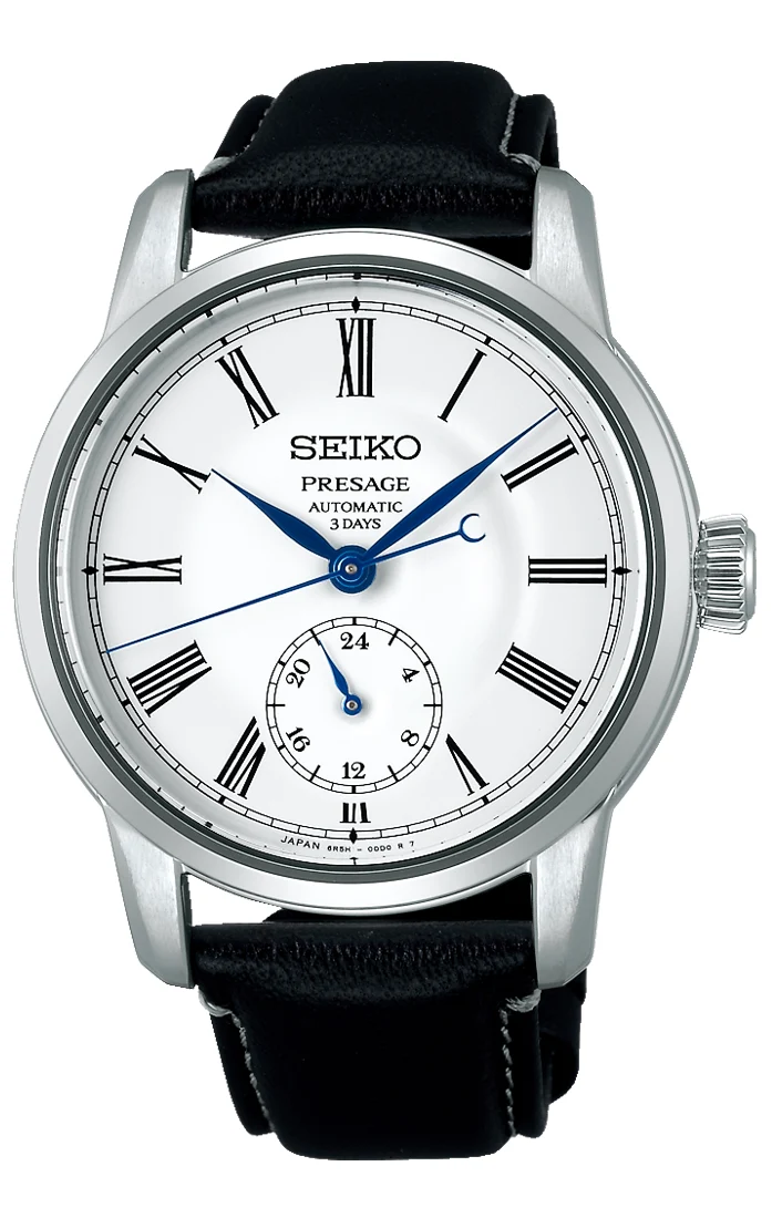 Hodinky doplňuje černý řemínek z teletiny s hladkou strukturou, pocházející z certifikované garbárny Leather Working Group. Díky měkkému povrchu a ergonomické přezce poskytuje výjimečné pohodlí při nošení. Skrze průhledné víko lze pozorovat práci autorského strojku Seiko 6R5H s automatickým nátahem a ukazatelem 24 hodin. Strojek nabízí rezervu chodu 72 hodin.