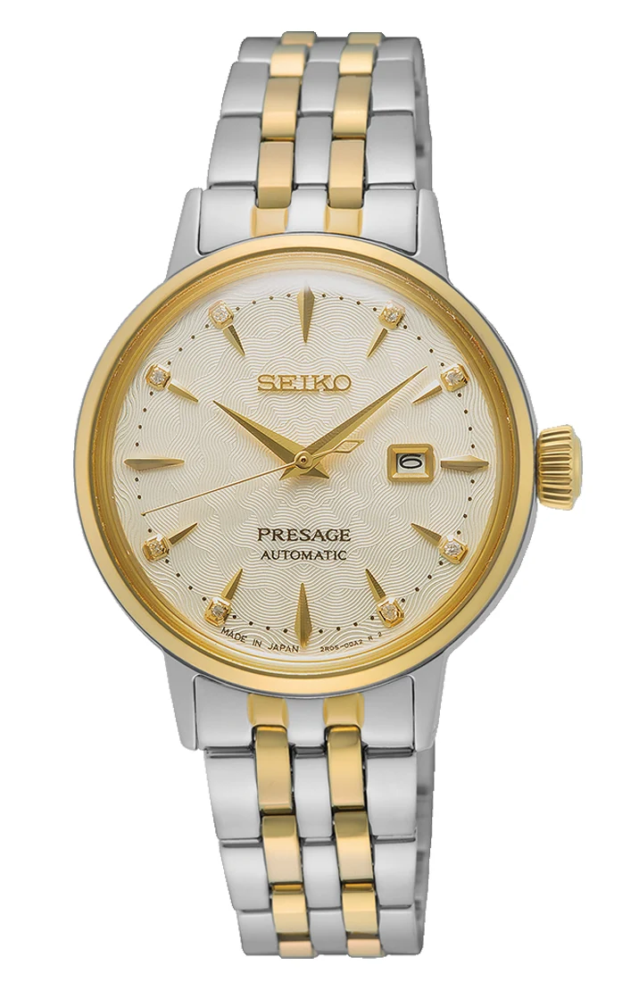Seiko Presage Diamond Cocktail Time SRE010J1, známý také jako White Lady Diamond Twist, jsou elegantní dámské hodinky inspirované klasickým koktejlem White Lady. Jejich jemná barevnost a lesk zlatých detailů odrážejí lehkost a vytříbený charakter nápoje, jehož elegance se stala inspirací pro tento model.
