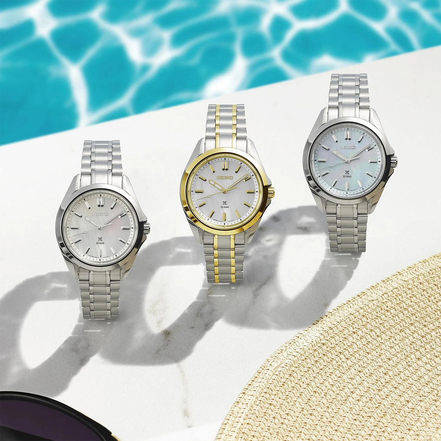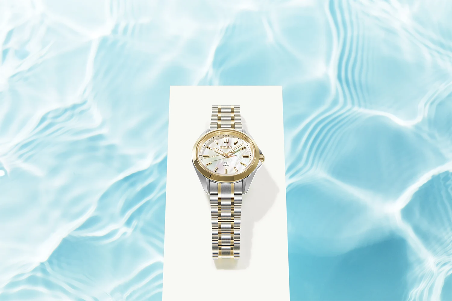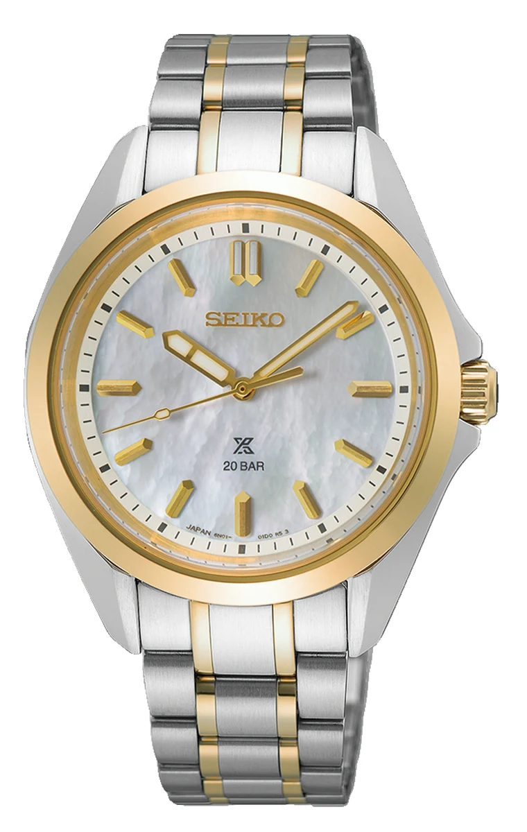 Číselník z přírodní perleti okouzluje jemnou hrou světla – každý kus má mírně odlišný odstín a strukturu, díky čemuž jsou hodinky naprosto jedinečné. Obdélníkové indexy v geometrickém tvaru ve zlatém tónu harmonicky ladí s leštěným pozlaceným kroužkem pouzdra. Aplikované logo SEIKO a znak Prospex pod šestou hodinou zdůrazňují profesionální původ modelu.