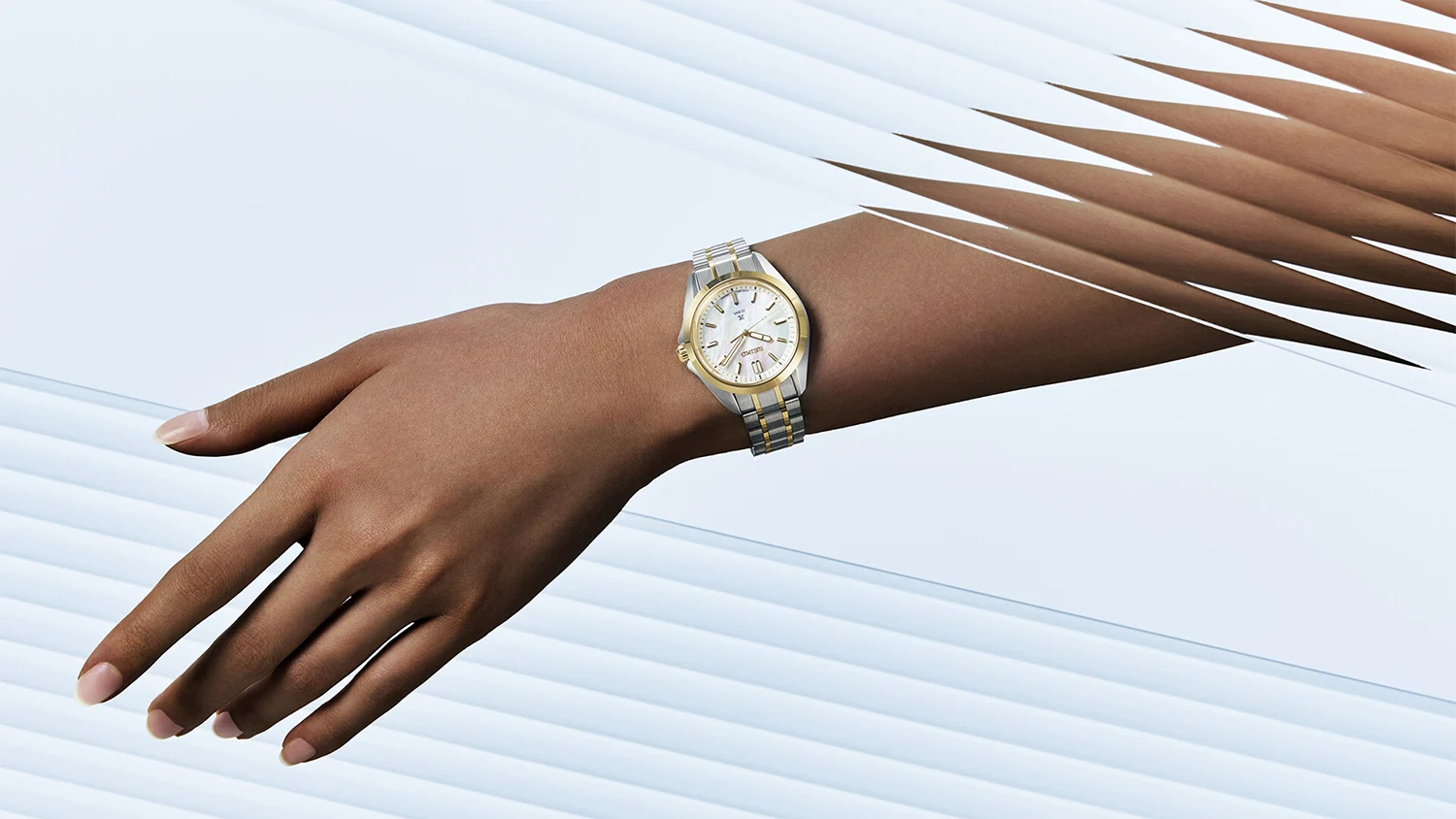 Pouzdro o průměru 34 mm je vyrobeno z ušlechtilé oceli a jeho povrch je doplněn akcenty ve zlatém odstínu. Dvoubarevný náramek kombinuje ocel a pozlacené prvky, čímž vytváří nadčasovou kompozici. Hodinky mají plnou vodotěsnost do 20 barů, takže se osvědčí jak při plavání, tak při každodenním nošení.