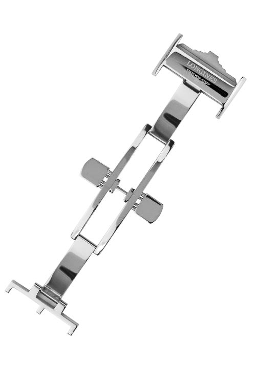 Originální motýlková spona na řemínky Longines . Vyrobeno z nejkvalitnější nerezové oceli leštěné do vysokého lesku. Otevírání pomocí tlačítek zajišťuje pohodlí při používání a bezpečnost, zabraňuje náhodnému rozepnutí. Název motýlí spona odkazuje na její design. Jedna strana je připevněna k opasku, kde se má použít spona nebo přezka, a druhá strana je připevněna k proražené části opasku pomocí špendlíkové části, která se otevírá zespodu. Motýlí spona Longines je k dispozici ve velikostech: 8, 10, 12, 14, 16, 18, 20 a 22 mm.
