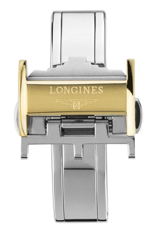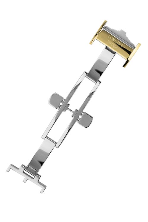 Originální motýlková spona na řemínky Longines . Vyrobeno z nejkvalitnější nerezové oceli s prvkem PVD žlutého zlata. Otevírání pomocí tlačítek zajišťuje pohodlí při používání a bezpečnost, zabraňuje náhodnému rozepnutí. Název motýlí spona odkazuje na její design. Jedna strana je připevněna k opasku, kde se má použít spona nebo přezka, a druhá strana je připevněna k proražené části opasku pomocí špendlíkové části, která se otevírá zespodu. Motýlí spona Longines je k dispozici ve velikostech 16 mm a 18 mm.