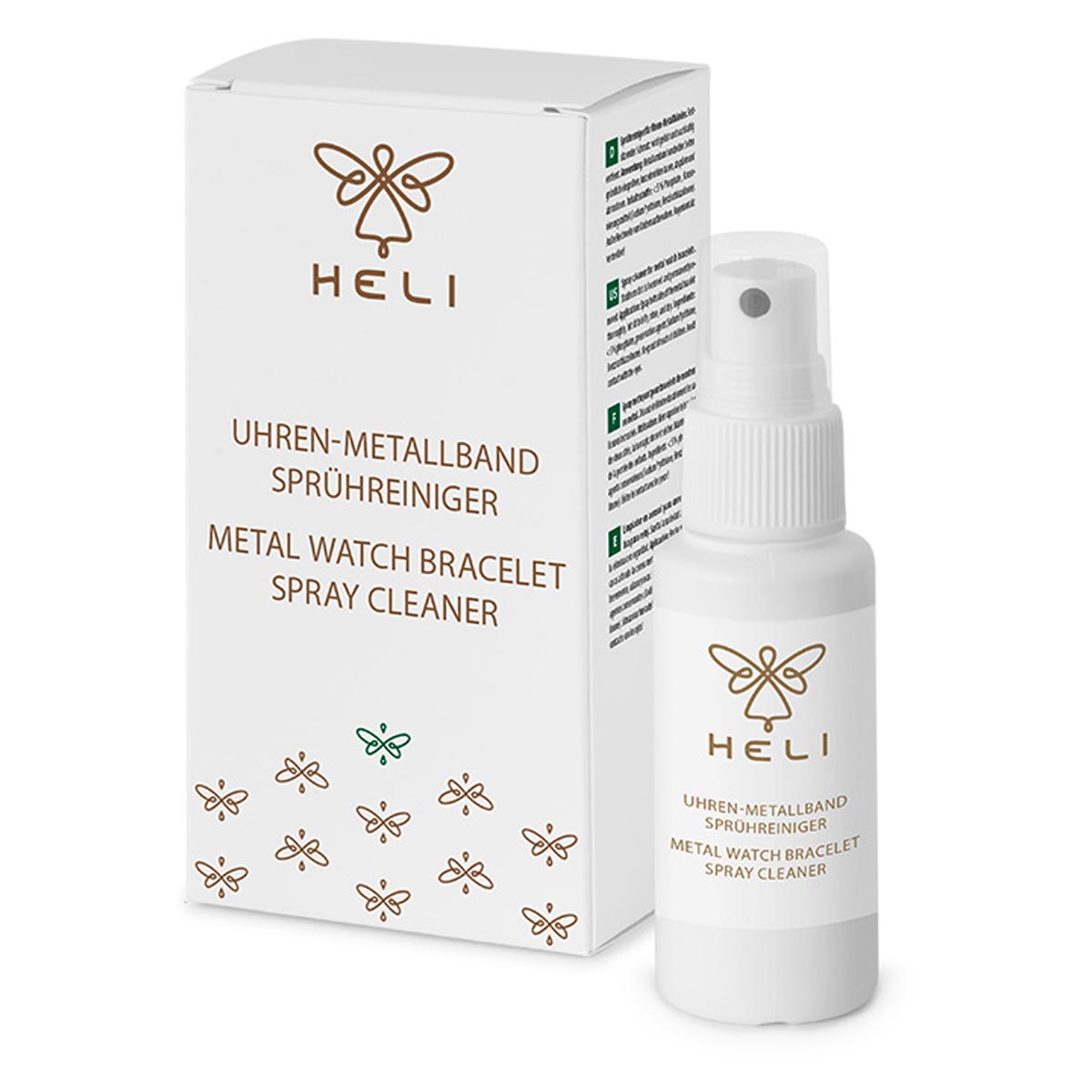 Heli 113047 čistící sprej na kovové náramky hodinek Náramek stačí nastříkat, pár minut počkat a opláchnout ve vlažné vodě. Heli sprej zajistí čistotu a příjemnou vůni. Díky speciálnímu složení jsou odolné nečistoty uvolněny a trvale odstraněny. Bez přísad, které mají být deklarovány podle nařízení EU o detergentech. Biologicky odbouratelné složení.