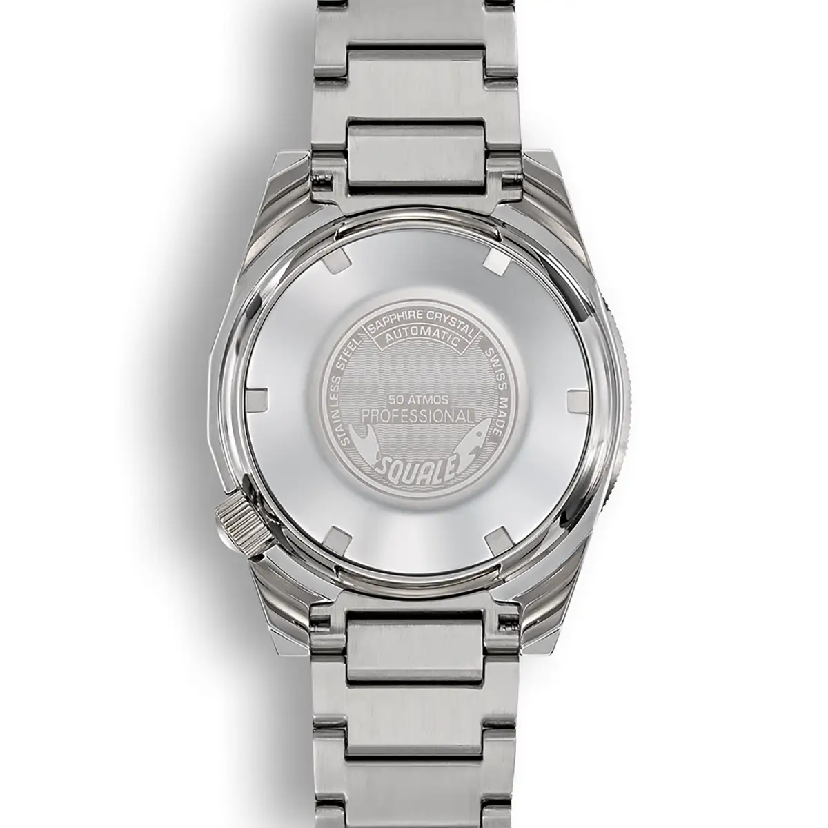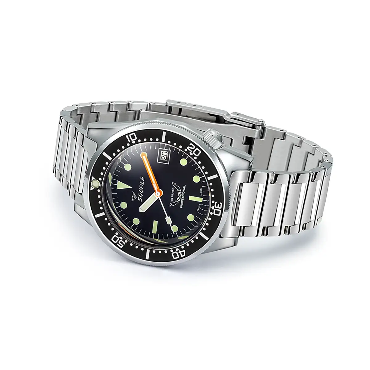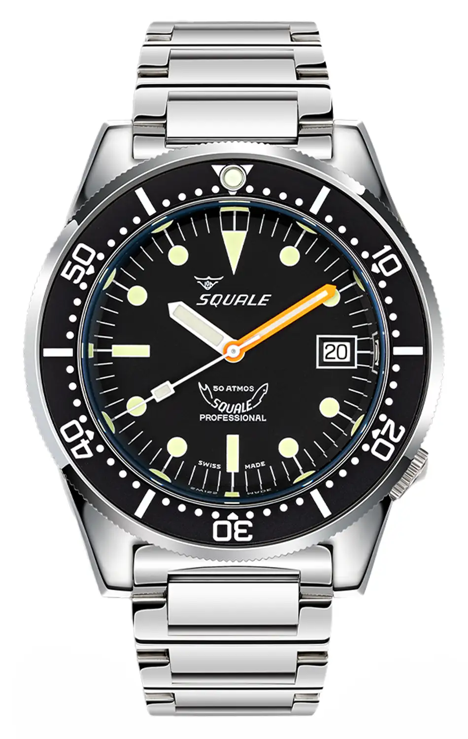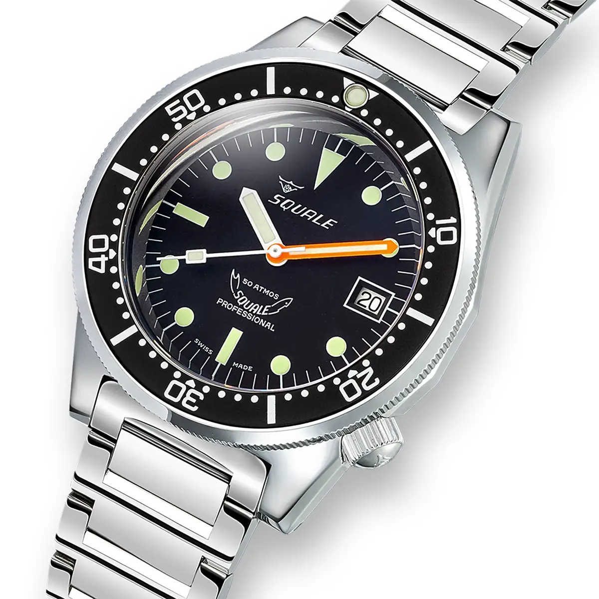 Matný černý ciferník je přehledný a vyvážený, s charakteristickými detaily značky Squale. Indexy a ručky jsou pokryty luminiscenční vrstvou Super-LumiNova®, která poskytuje výjimečnou čitelnost ve tmě i v hlubinách. Prvky jsou malované, což podtrhuje strohý, nástrojový charakter modelu. Hodinky jsou vybaveny praktickým datem na pozici 3. hodiny a oranžovou minutovou ručkou, která usnadňuje kontrolu doby ponoru.