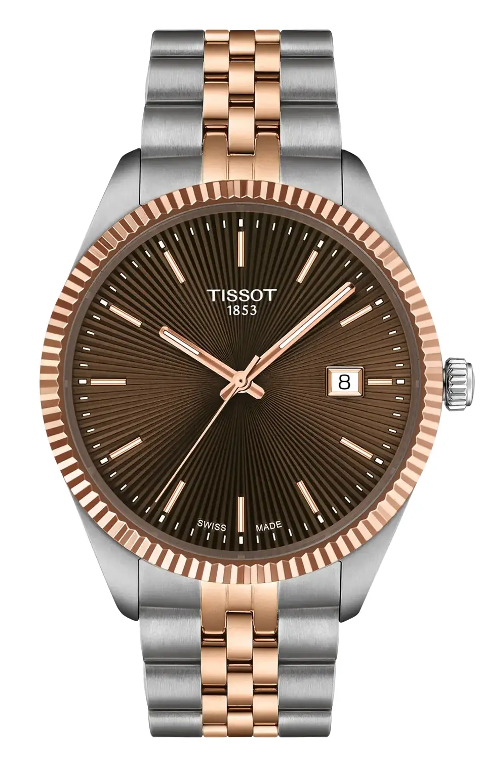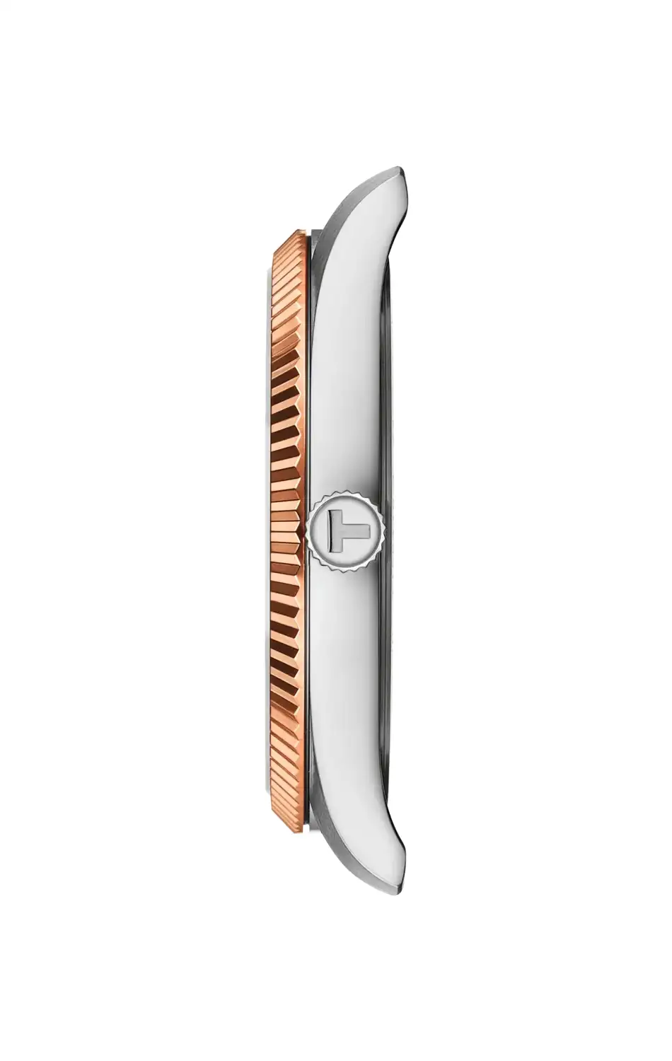 Kulaté pouzdro o průměru 40 mm je vyrobeno z ušlechtilé oceli a spojeno s masivním dvoubarevným ocelovým náramkem s motýlovou sponou, čímž vytváří soudržnou a dobře vyváženou konstrukci na zápěstí. Charakteristická vroubkovaná luneta v barvě růžového zlata PVD dodává celku výrazný, avšak stále elegantní charakter a odkazuje na klasické hodinky švýcarské značky Tissot. Model je vybaven safírovým sklíčkem s antireflexní vrstvou odolným proti poškrábání a vodotěsností do 100 metrů, což umožňuje bez obav nosit hodinky i při plavání. Jejich srdcem je přesný švýcarský strojek ETA s funkcí End Of Life, která informuje o nutnosti výměny baterie charakteristickým skokem sekundové ručky každé čtyři sekundy.