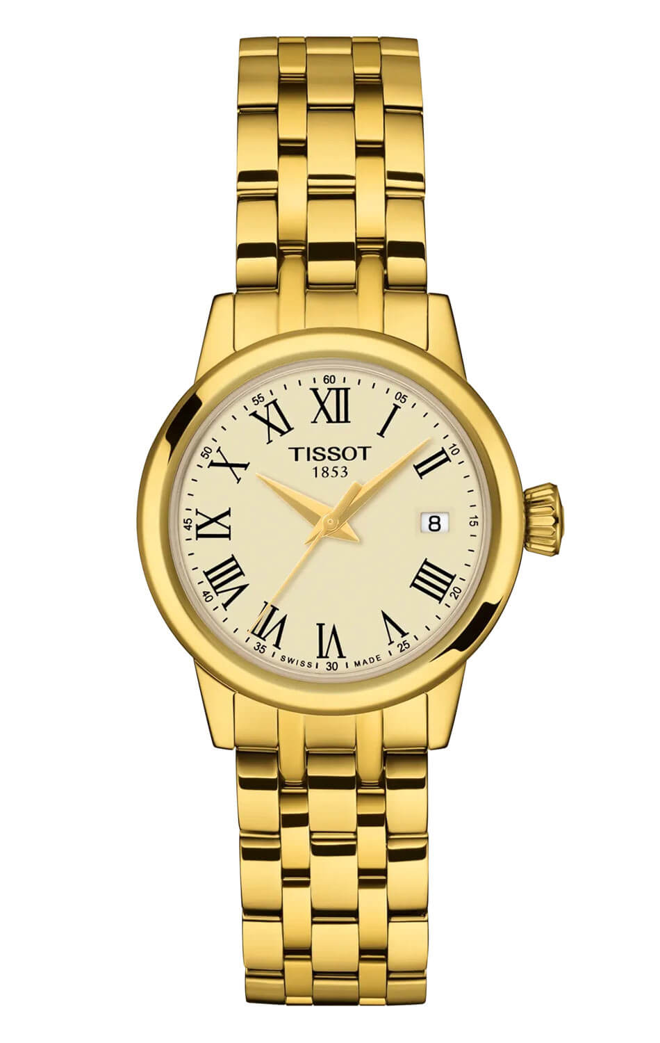 Pouzdro o průměru 28 mm je vyrobeno z ušlechtilé oceli a potaženo odolnou pozlacenou vrstvou PVD, díky čemuž si hodinky uchovají svůj lesk po mnoho let. Ciferník v odstínu šampaňského zlata s římskými číslicemi a datem na třetí hodině spojuje klasiku s funkčností. Z přední strany jej chrání safírové sklo odolné proti poškrábání a celek uzavírá ocelové víko. Pozlacený náramek s jemným spletem dodává celku eleganci i pohodlí při nošení. Tissot Classic Dream Lady jsou pozlacené hodinky na náramku, které spojují tradici Swiss Made s každodenní praktičností – symbol ženské jemnosti v nadčasové podobě.