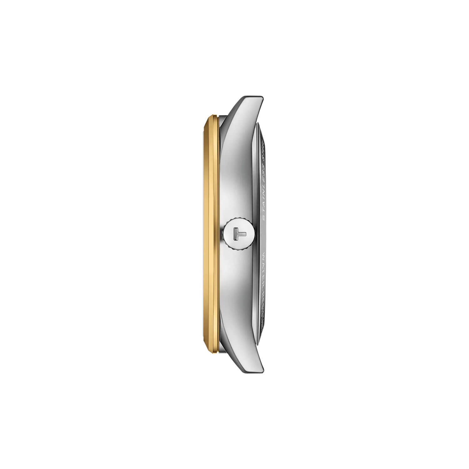 Pouzdro o průměru 40 mm je vyrobeno z nerezové oceli 316L, což zaručuje odolnost vůči korozi a dlouhou životnost. Luneta je pokryta PVD vrstvou ve zlatém odstínu. Na zápěstí působí hodinky lehce a díky klasickému tvaru mají nadčasové kouzlo, které nepodléhá módním trendům. Ocelový náramek se systémem rychlé výměny umožňuje snadné přizpůsobení hodinek osobnímu stylu – během několika sekund jej lze vyměnit za kožený nebo gumový řemínek značky Tissot. Celek doplňuje safírové sklíčko odolné proti poškrábání a ocelové dýnko, které spolehlivě chrání vnitřní mechanismus.