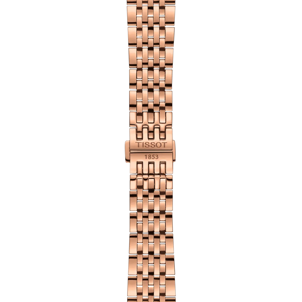 Model okouzluje precizním provedením a pečlivým zpracováním detailů. Pouzdro z nejkvalitnější nerezové oceli o průměru 39,30 mm je ideální volbou pro muže preferující harmonické proporce. Průhledné víko zdobí jemné gravury odkazující na dlouhou historii značky a její kořeny. Víko je vizuálním příběhem o tradici a hodinářském umění značky Tissot. Pozornost si zaslouží také náramek z nerezové oceli s drobnými články, které se lehce přizpůsobují zápěstí a zajišťují pohodlí po celý den. Motýlková spona nejen garantuje bezpečné zapnutí, ale zároveň podtrhuje stylistickou soudržnost hodinek. Pouzdro i náramek jsou potaženy růžově zlatou vrstvou PVD, která dodává výjimečný charakter a zároveň posiluje celou konstrukci. Každý detail byl promyšlen tak, aby tento časoměřič okouzloval trvanlivostí a estetikou.