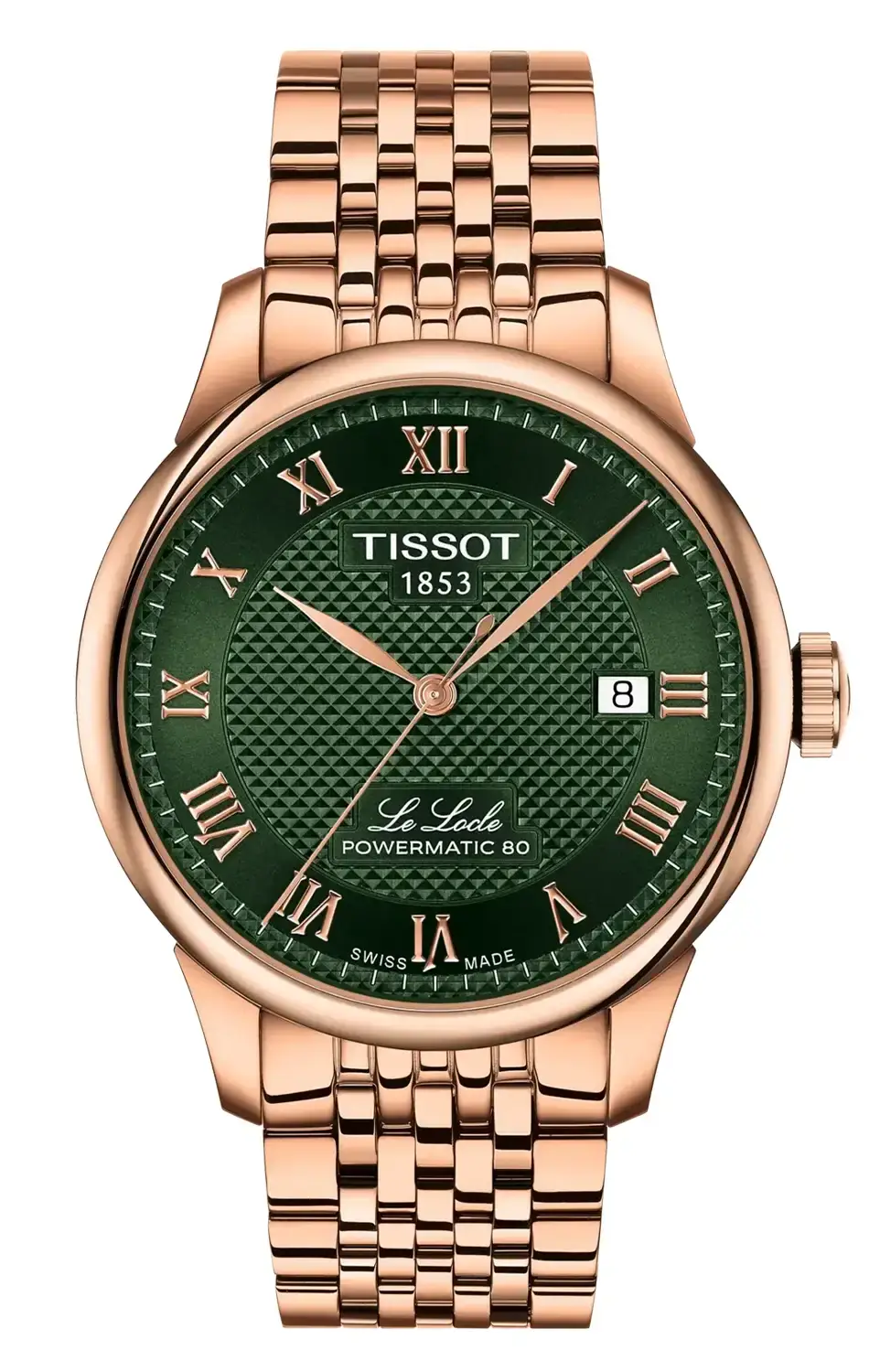 Čelní strana hodinek Tissot T006.407.22.093.01 je tvořena tmavě zeleným ciferníkem se vzorem Clous de Paris – jemnou strukturou připomínající drobné diamantové důlky – která dodává ciferníku výjimečnou hloubku. Římské číslice v kombinaci s tenkými, stříbřitými ručkami přinášejí klasickou eleganci na nejvyšší úrovni. Na pozici třetí hodiny se nachází datumovka se světlým pozadím – praktické řešení, které nenarušuje harmonii designu, ale zvyšuje jeho funkčnost. Srdcem hodinek je švýcarský automatický strojek Powermatic 80 – esence spolehlivosti a přesnosti. Tento mechanizmus zajišťuje rezervu chodu až 80 hodin, což znamená, že časoměřič běží nepřetržitě přibližně tři dny bez nutnosti natahování.