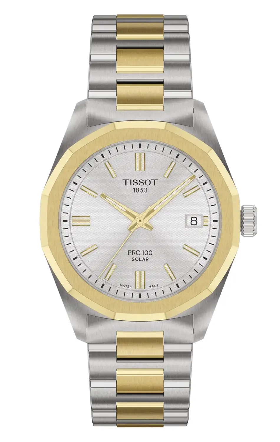 Pozlacené ručky a indexy jsou potaženy vrstvou Super-LumiNova®, která zajišťuje vynikající viditelnost ve tmě, a integrované datumové okénko na třetí hodině zvyšuje funkčnost modelu. Díky vodotěsnosti do 100 metrů se hodinky skvěle osvědčují jak při každodenních aktivitách, tak i při rekreačním kontaktu s vodou. Tissot PRC 100 Solar T151.822.22.031.00 na náramku v dámské verzi představují esenci inteligentní elegance - spolehlivého partnera v dynamickém a stylovém životě.